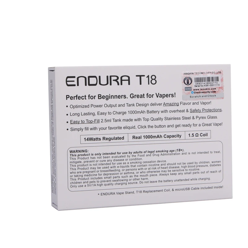 Le Innokin ENDURA est l'alternative fumante ultime qui offre une expérience supérieure dans un kit tout en un compact, résistant et abordable. Il comprend la batterie ENDURA, le réservoir prisme T18, la bobine de remplacement, le cordon Micro USB et le support de Vape. le Innokin ENDURA est un vaporisateur personnel avancé à 1 bouton, facile à remplir et facile à utiliser, durable, compact et élégant. Optimisé à 14 Watts avec des bobines remplaçables de 1,5Ω, l'endura délivre une expérience de vapotage parfaite à chaque fois. Le débardeur ENDURA T18 Pyrex et inox 2.5 ml est à remplissage par le haut pour des recharges rapides et propres et le matériau japonais en coton bio qui évacue la transpiration offre un maximum de saveurs de vos eliquids préférés. avec 1000 mAh de capacité réelle de batterie, L'endura peut être facilement chargé via un câble Micro USB standard et dispose de la technologie «vape tout en chargeant» d'innokin pour un vaporisateur quotidien sur lequel vous pouvez compter.