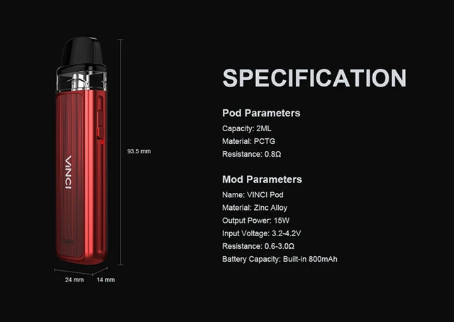 Le Kit VOOPOO Vinci Pod est le système unique de pod Vinci de la famille Vinci populaire. Intégrant une batterie rechargeable de 800mAh, le Vinci utilise le jeu de puces GENE intelligent avec une sortie constante de 15W et un mécanisme de tir activé par tirage pour une vaporisation agréable en déplacement. Construit en alliage de zinc durable, le Vinci Pod dispose d’un châssis compact bien conçu avec une finition CMF extraordinaire pour un look époustouflant. Vinci Pod adopte la conception étanche et le système de flux d’air infini, livré avec une bobine intégrée de 0,8 ohm mettant en œuvre la nouvelle technologie de vaporisation ITO pour produire une saveur optimale et une vapeur lisse.