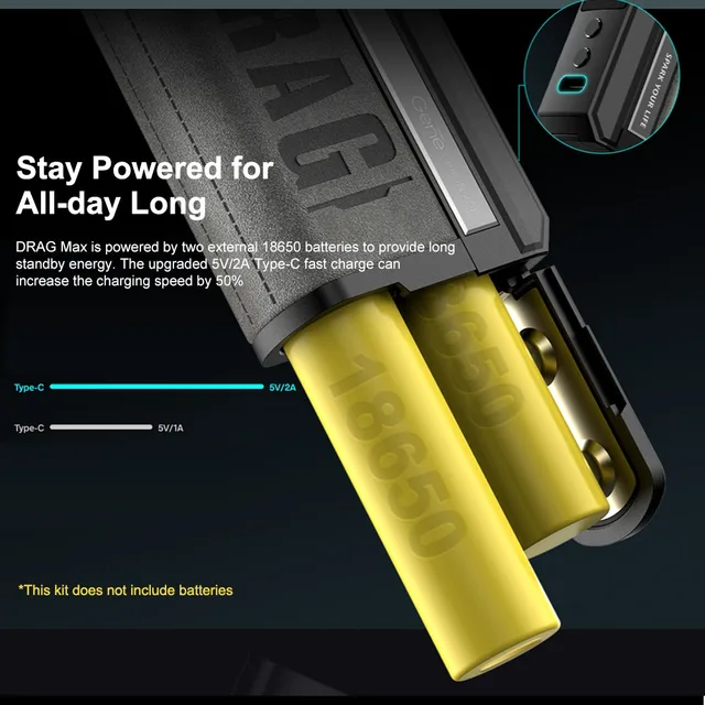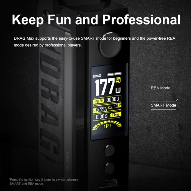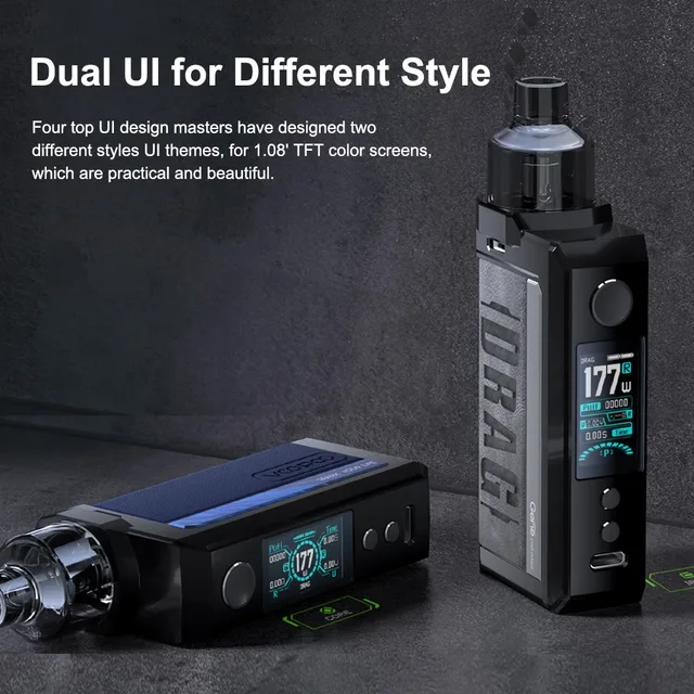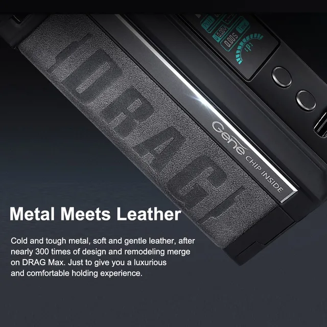 Drag Max Kit est un dispositif époxy à double batterie avec atomiseur magnétique. Il est alimenté par deux batteries 18650 avec une plage de puissance de 5-177W. Fabriqué en métal et en cuir, il est résistant et doux. La marque nouvellement mise à niveau GEME.FAN 2.0 chip donne Drag Max certaines fonctions innovantes, telles que l’allumage extrême 0.001s, la sortie stable dynamique, interactif intelligent. Il est livré avec deux thèmes d’interface utilisateur de styles différents, vous pouvez profiter des deux thèmes avec un écran couleur TFT de 1.08 pouces. De plus, Drag Max offre deux modes pour répondre aux différents besoins de vaporisation: mode intelligent facile à utiliser pour les débutants, mode RBA sans alimentation pour les vapeurs professionnelles. Il a une compatibilité universelle de l’atomiseur: PnP Pod, PnP MTL Pod, PnP RTA Pod et vous pouvez utiliser celui que vous aimez avec Drag Max. Il est également compatible avec toutes les bobines PnP. La capacité du pod est de 4.5ml.