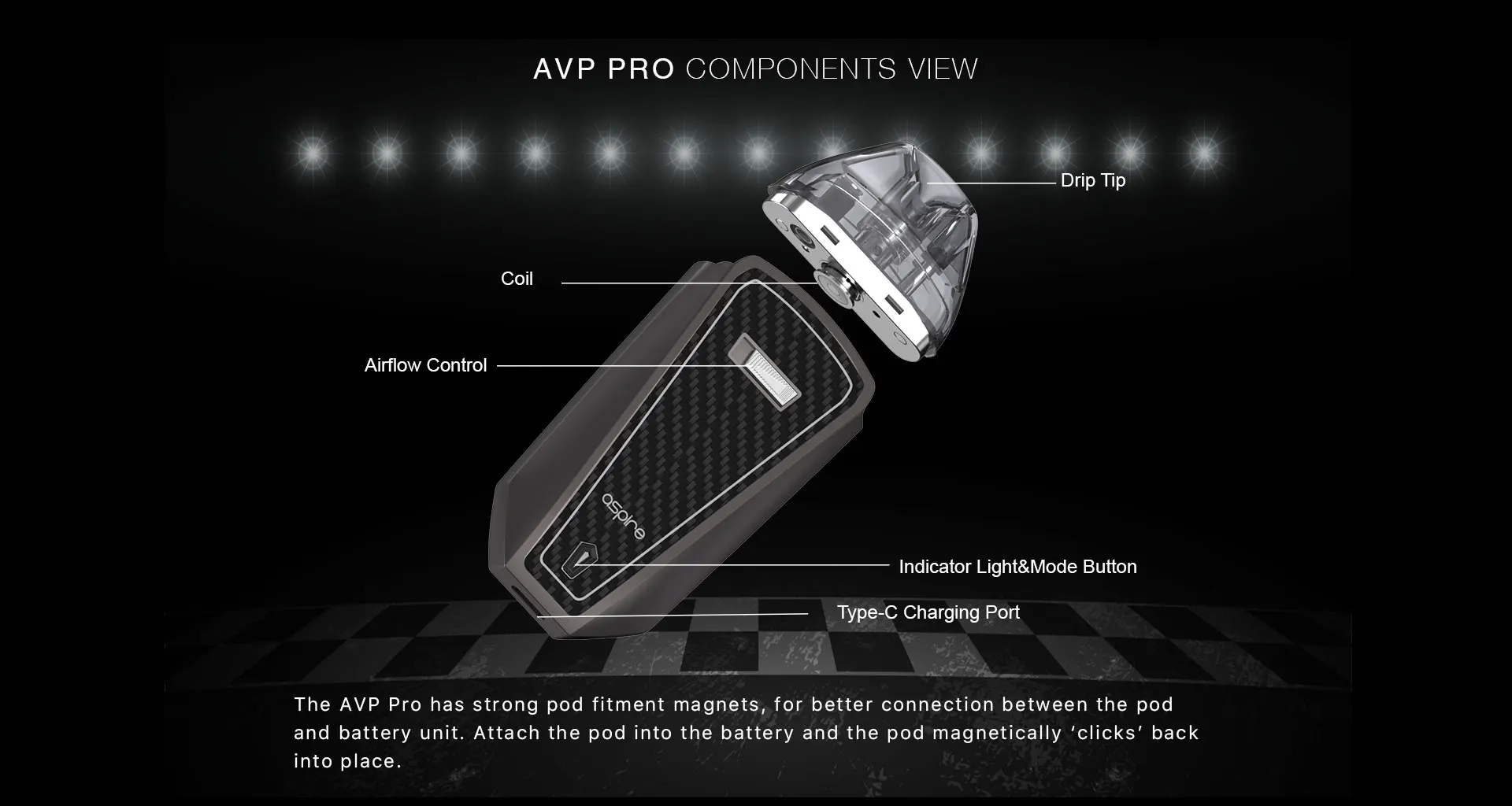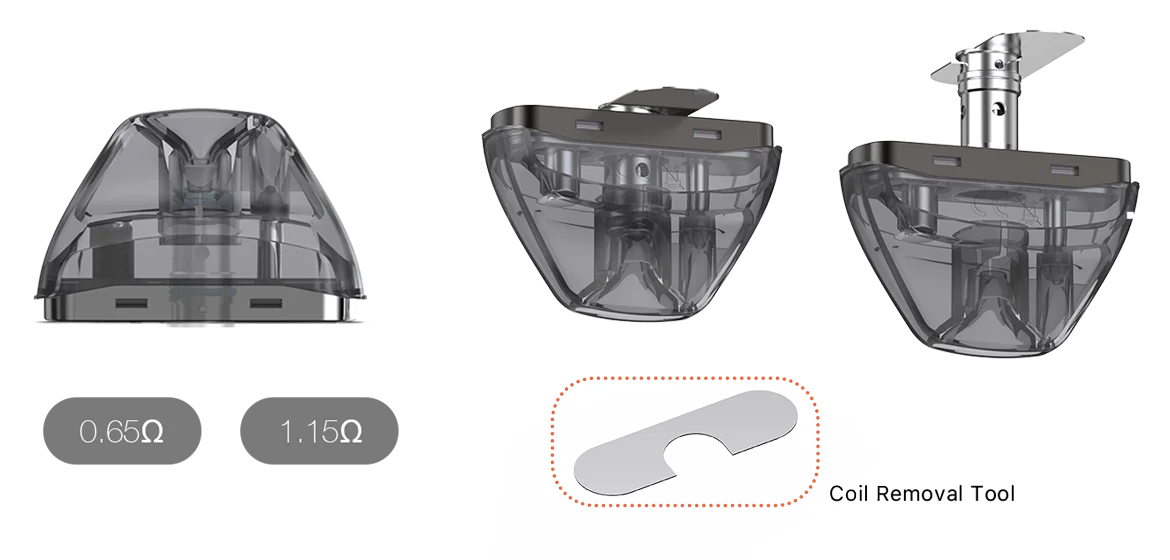 AVP Pro utilise un système de remplacement de bobine pull-and-push. Retirez la bobine du bas du pod, puis remplacez-la par une unité fraîche. Vous pouvez changer la bobine même lorsqu’il y a du e-liquide à l’intérieur du pod.