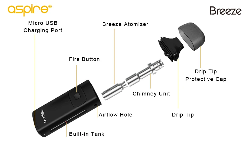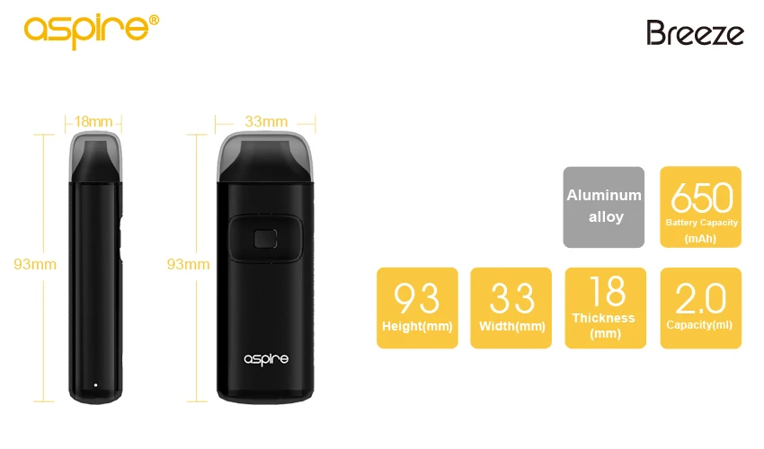 Aspire breeze – Cigarette électronique avec réservoir de 650 ML, Kit Pod, batterie 2.0 mAh, bobine remplaçable, 0,6 ohm ou ohm, en Stock