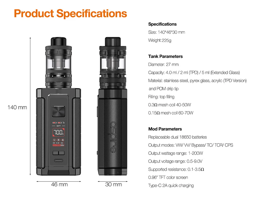 Aspire Vrod Kit Original 200W avec réservoir 4ml Guroo 0.3ohm /0.15ohm bobine de maille Compatible avec double Kit de Cigarette électronique 18650