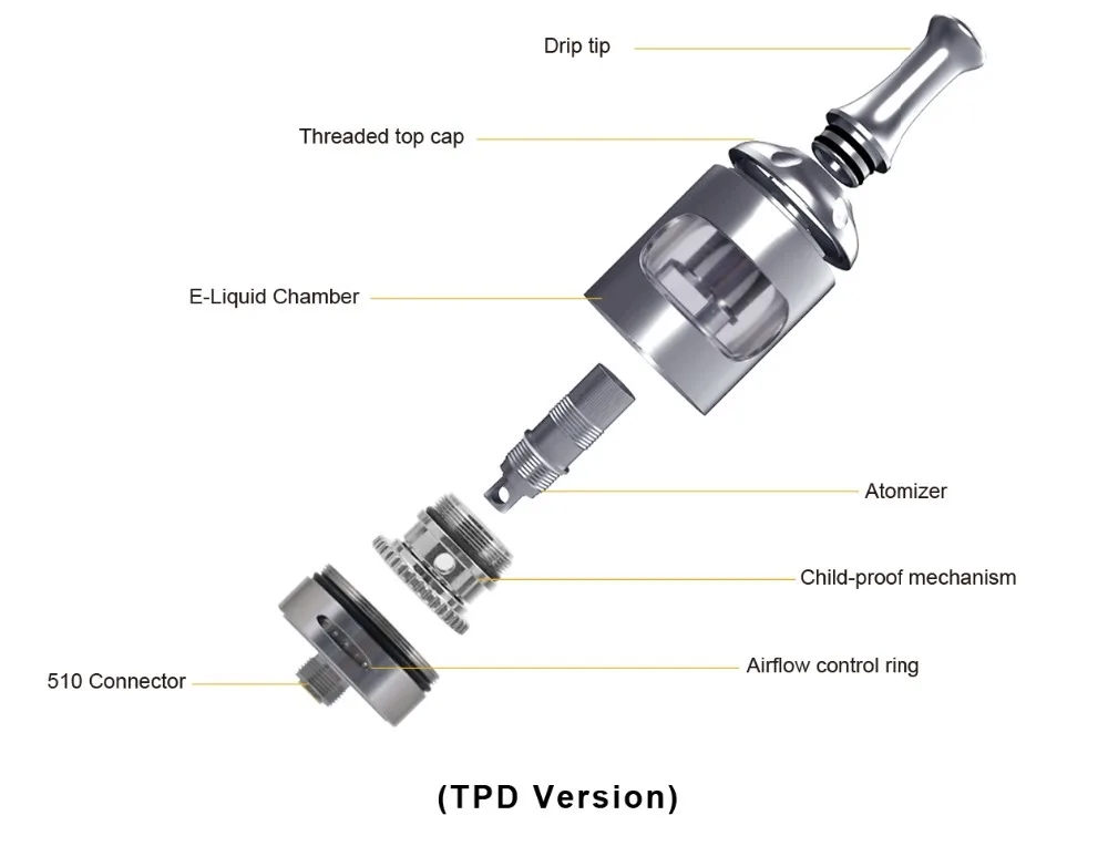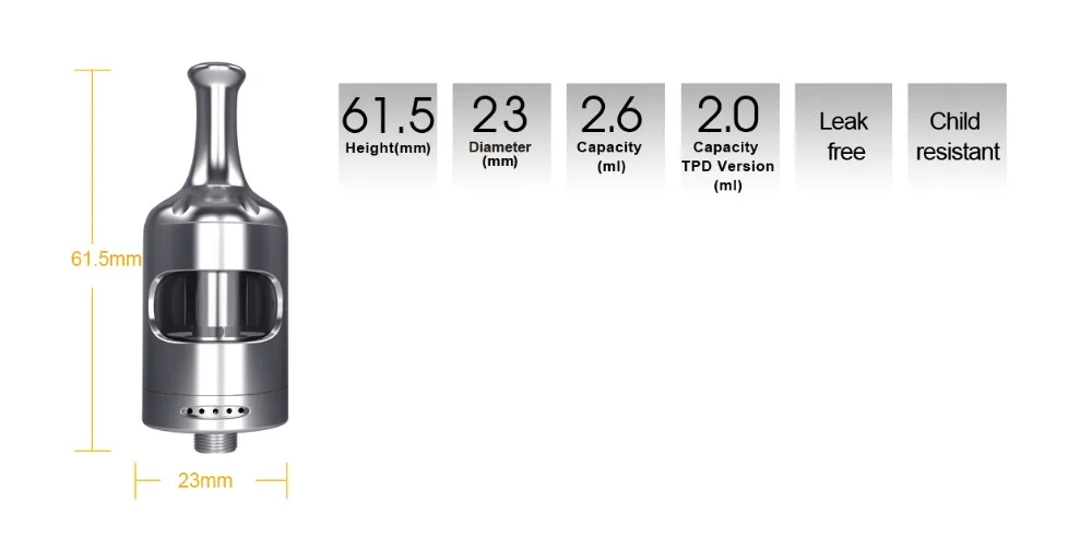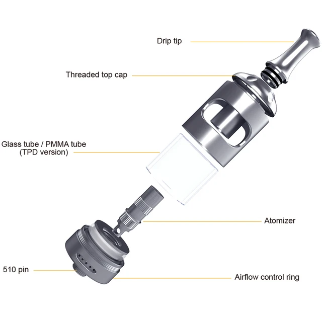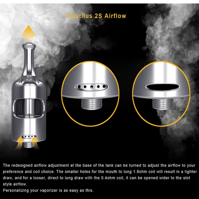 Le réglage du débit d’air redessiné à la base du réservoir peut être tourné pour ajuster le débit d’air selon vos préférences et choix de la bobine. Les trous de l’écouteur pour la bobine de 1,8 ohm de la bouche au sein entraîneront un tirage plus serré, et pour un tirage plus lâche, direct au sein avec la bobine de 0,4 ohm, il peut être ouvert plus large au flux d’air de style fente.