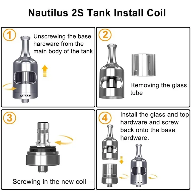 L’installation de la bobine est aussi simple que de dévisser le matériel de base du corps principal du réservoir, d’enlever le tube en verre, puis de visser la nouvelle bobine. Ensuite, remplacez le verre et le matériel supérieur, et revissez le matériel de base. Le nouveau réservoir Aspire Nautilus 2S est compatible avec les bobines Nautilus BVC.