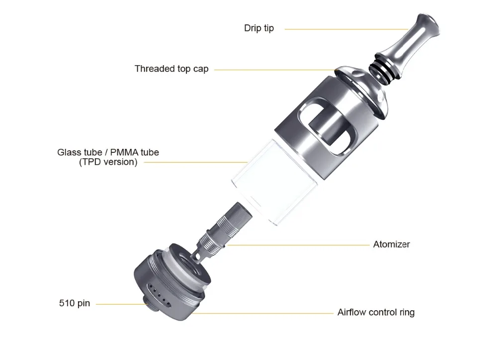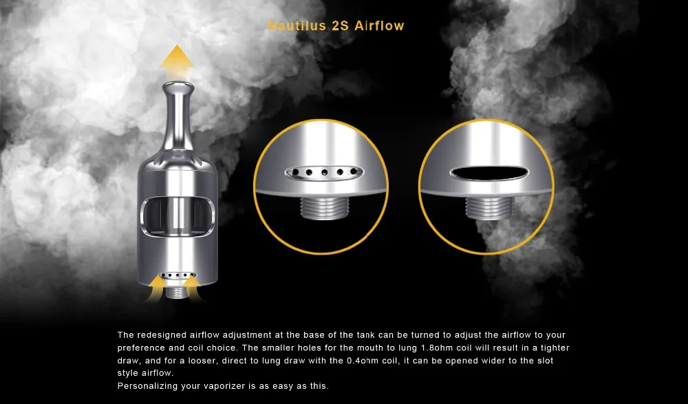 Le réglage du débit d’air redessiné à la base du réservoir peut être tourné pour ajuster le débit d’air selon vos préférences et choix de la bobine. Les trous de l’écouteur pour la bobine de 1,8 ohm de la bouche au sein entraîneront un tirage plus serré, et pour un tirage plus lâche, direct au sein avec la bobine de 0,4 ohm, il peut être ouvert plus large au flux d’air de style fente.