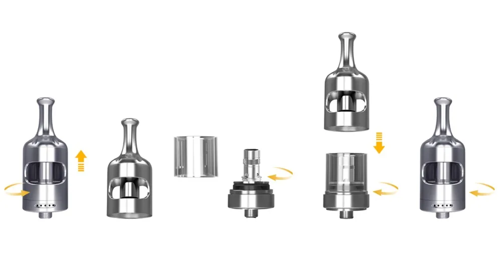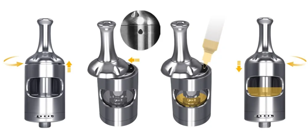Remarque: lors de l’installation d’une nouvelle bobine, laissez les réservoirs rester debout pendant 5 minutes après le remplissage pour permettre au coton de saturer complètement d’éliquide pour éviter d’endommager la bobine et/ou de brûler le matériau d’évacuation.