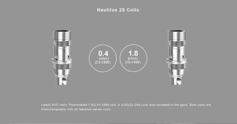 Dernières bobines BVC. La bobine préinstallée de 1,8 ohm(10-14w) et la bobine de 0,4 ohm (23-28w) sont également incluses dans l’emballage. Les deux bobines sont interchangeables avec toutes les bobines de la série Nautilus