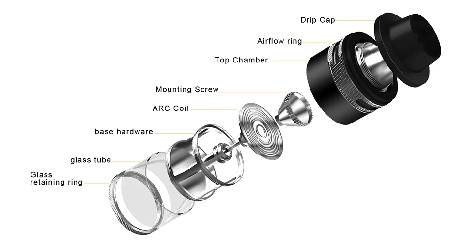 Anneau de retenue en verre, tube en verre, quincaillerie de base, bobine d’arc, vis de montage, chambre supérieure, anneau de flux d’air, capuchon d’égouttage