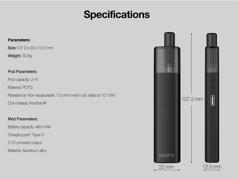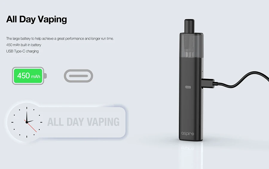 Aspire Vilter Vape Kit Cigarette électronique Pod Mod système filtre en papier conception de pointe d’égouttage pour arrêter de fumer avec bobine de maille de 1.0ohm batterie de 450mAh