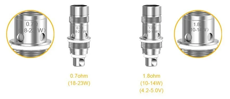 Dernière BVC bobines. Bobine préinstallée 0,7Ω (18-23w). Une bobine de 1,8 Ω (10-14W) est également incluse dans le kit. Les deux bobines sont interchangeables avec toutes les bobines de la série Nautilus.