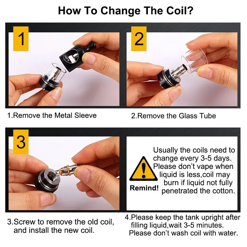 1. Le noyau de l’atomiseur est des consommables faciles, normalement nous vous suggérons de changer la bobine toutes les une ou deux semaines. Si vous utilisez la bobine trop longtemps, le liquide s’écoulera hors de la base.