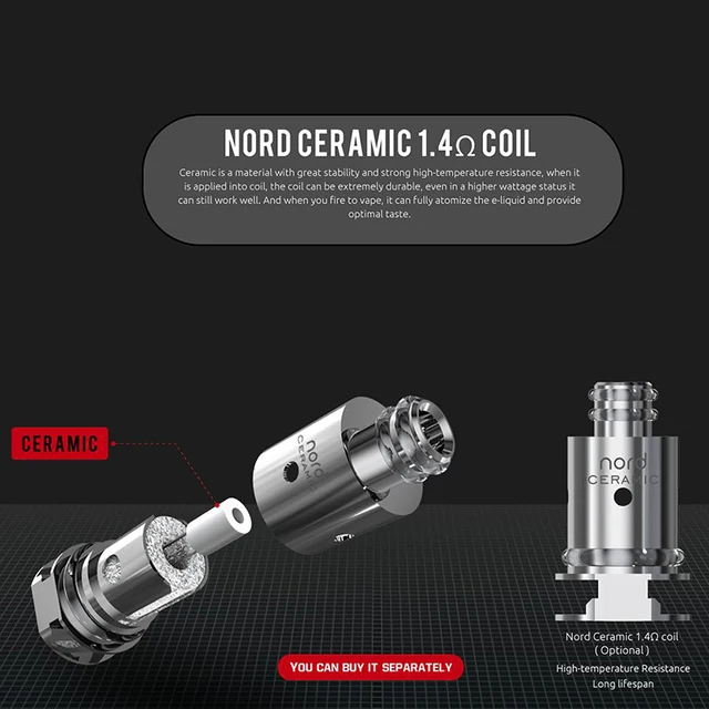 La bobine régulière 1.4ohm et la bobine mesh-MTL 0.8ohm sont conçues pour le vapotage MTL. La bobine 1.4ohm en céramique est parfaitement compatible avec l’huile CBD. Alors que la bobine Nord DC présente une résistance de 0,6ohm pour une intensité de saveur plus élevée.