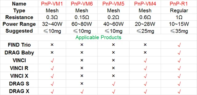 5 pièces de bobine PnP VM1 0,3 ohm, bobine de remplacement d’évaporateur VM4 0,6 ohm /VM6 0,15 ohm /R1 0,8 ohm, bobine PnP pour VINCI Drag X/S Mod Pod Kit
