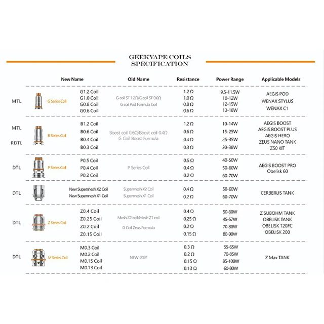 • Résistance de la bobine: bobine de maille de 0,2 ohm, bobine de maille de 0,4 ohm, bobine de P 0,5 ohm