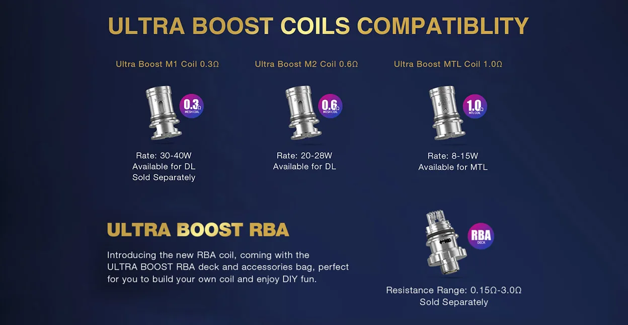 | Coil Type | M1 Coil 0.3ohm(30-40W), M2 Coil 0.6ohm(20-28W), MTL Coil 1.0ohm(8-15W) |