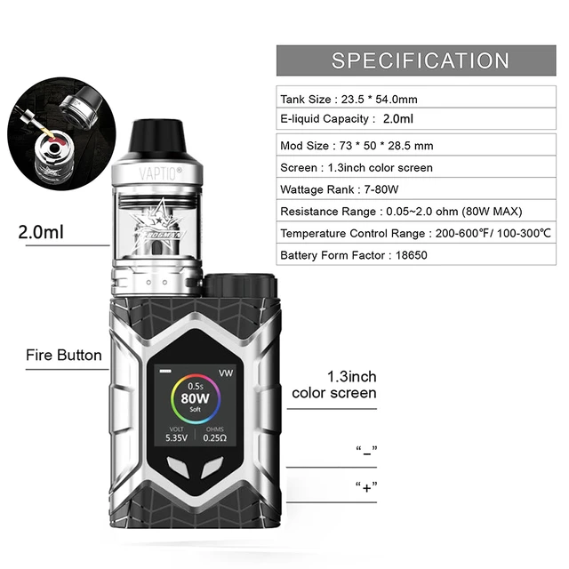 Cadeaux gratuits! Vaptio – Cigarette électronique TCR 2.0 pouces, sur chenilles murales, 0.05 ML/5ML, 80W, résistance 1.3/2ohm, sans batterie