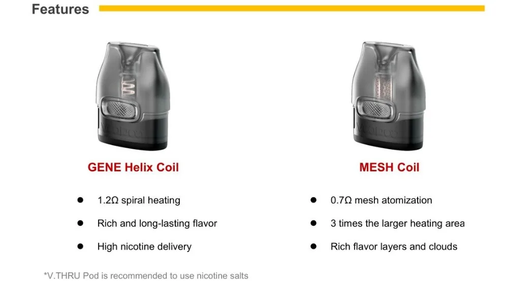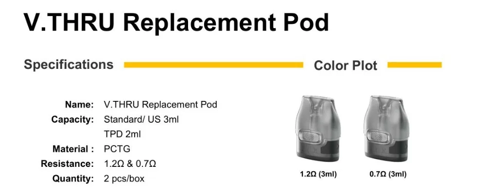 V.THRU Pro Pod est créé pour le Kit VOOPOO V.THRU Pro. Il a deux types de résistance à choisir: 0,7 ohm et 1,2 ohm. La capacité est de 3ml. Fabriqué par PCTG, il est sûr et sain à utiliser. Doté d’un design entièrement ajusté à 360 °, le Pod V.THRU Pro vous apportera une gamme complète de confort pour les lèvres. Il suffit de le prendre pour votre appareil V. Through. 2 pièces par paquet.