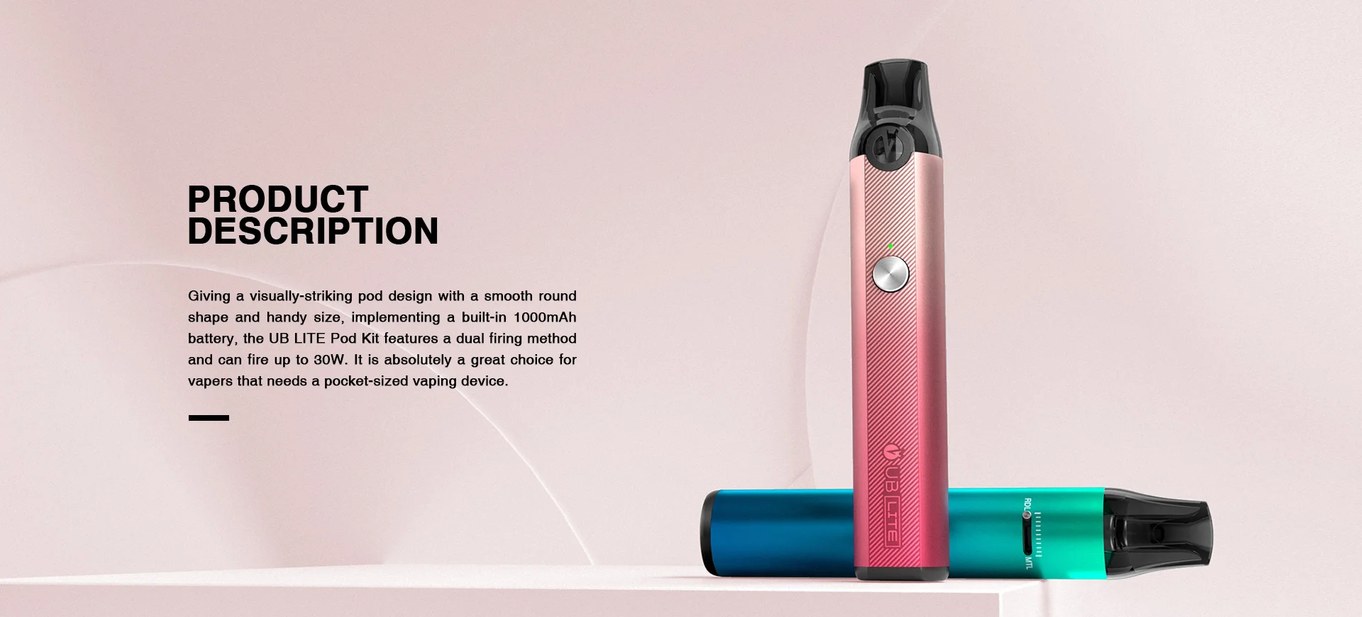 UB Lite Pod Kit est le dernier appareil de vapotage de la série Lost Vape Quest. Le Kit de système de Pod Lost Vape UB Lite présente un design visuellement frappant, une forme ronde lisse et est livré avec une batterie intégrée de 1000mAh. Cette pratique taille mod est chargé intégré DC 5V port Type-c, LUMIÈRE LED peut montrer la puissance de la batterie. Avec la double méthode de cuisson, le Kit UB Lite Pod peut tirer jusqu’à 30W de puissance maximale pour plus de chaleur et de saveurs. La cartouche UB Lite Pod a une capacité de 2ml de jus électronique avec système de remplissage latéral. Il est compatible avec les nouvelles bobines de maille de la série UB Lite pour une vaporisation délicieuse MTL/DTL.