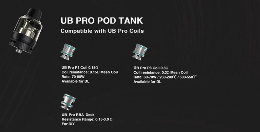 Le réservoir UB Pro Pod est adapté au Kit Lost Vape Grus 100W. Il est conçu avec un système de flux d’air réglable et équipé de trois canaux de flux d’air, qui produiront les nuages les plus équilibrés et les plus savoureux et vous permettront une excellente expérience de vapotage. Le réservoir UB Pro Pod peut contenir une capacité de 5ml de jus électronique avec un remplissage latéral pratique. Il est compatible avec les bobines UB Pro pour vous offrir un excellent style de vapotage DL. Deux bobines sont incluses.