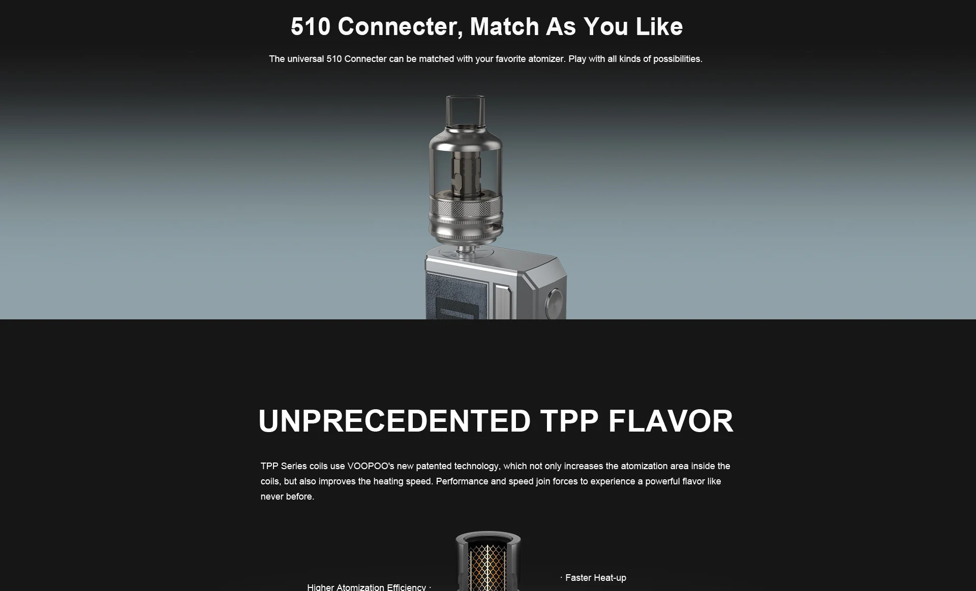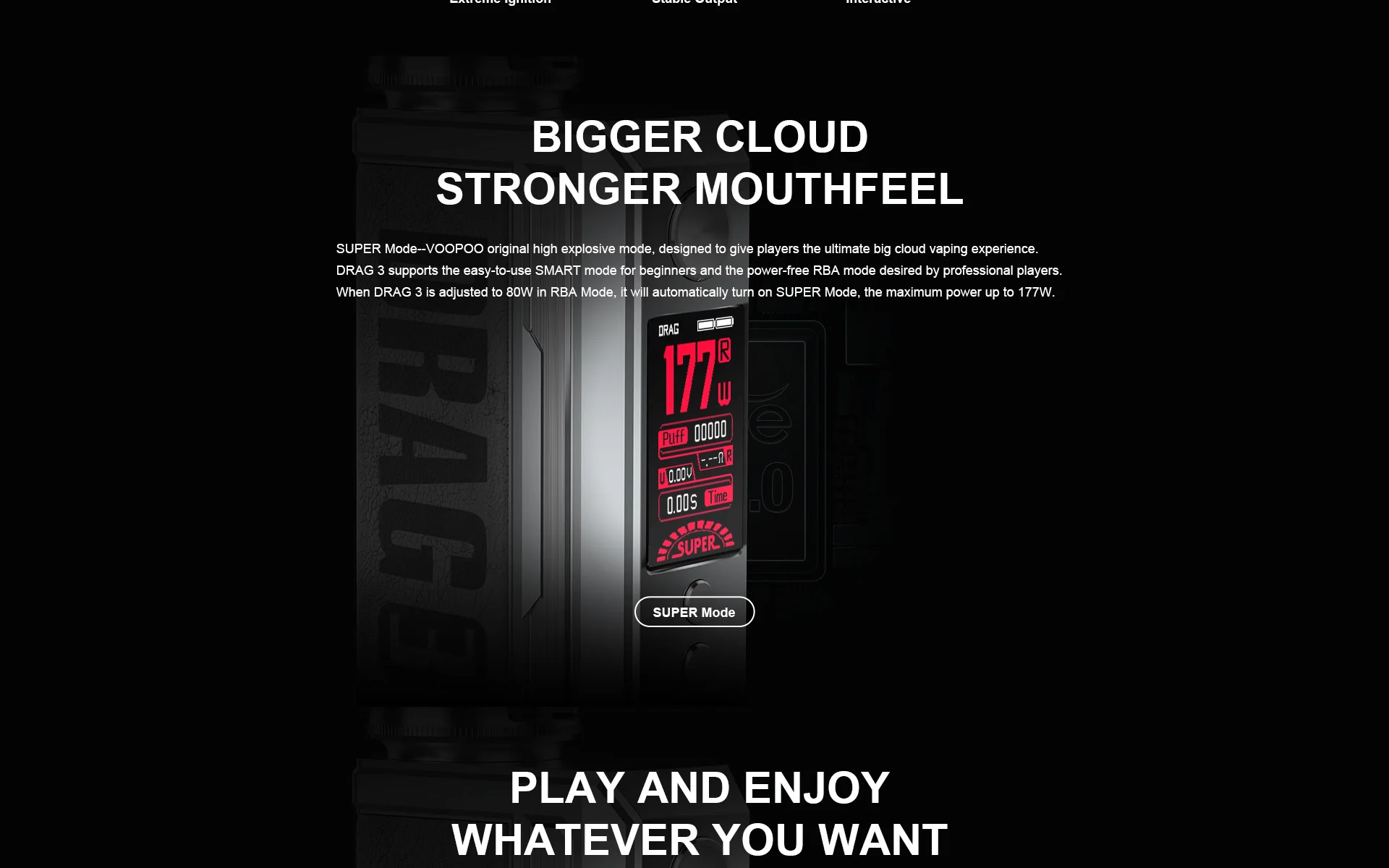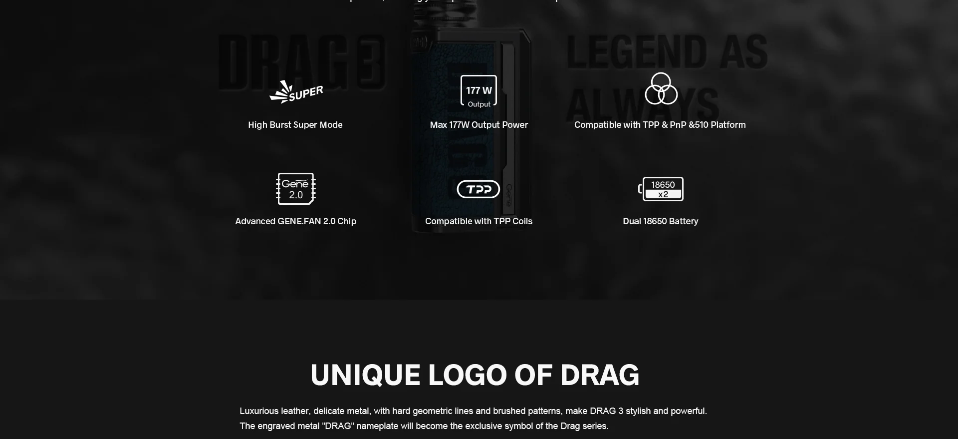 Le Kit VOOPOO DRAG 3 177W TC avec réservoir TPP améliore votre expérience de vapotage à un nouveau niveau. Le VOOPOO Drag 3 MOD est alimenté par deux batteries 18650, produisant jusqu’à une puissance maximale de 177W. La puce GENE.FAN 2.0 innovante adopte une nouvelle interface utilisateur pour fournir un système d’exploitation plus convivial. Le réservoir VOOPOO TPP est un nouveau concept d’atomiseur qui est un réservoir à 510 filetage. L’atomiseur VOOPOO TPP est compatible avec toutes les bobines TPP. Le VOOPOO Drag 3 vous apportera une expérience de vapotage relaxante et fantastique.