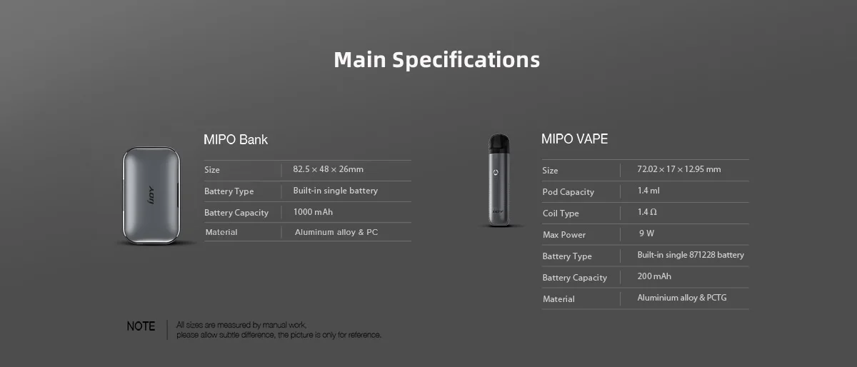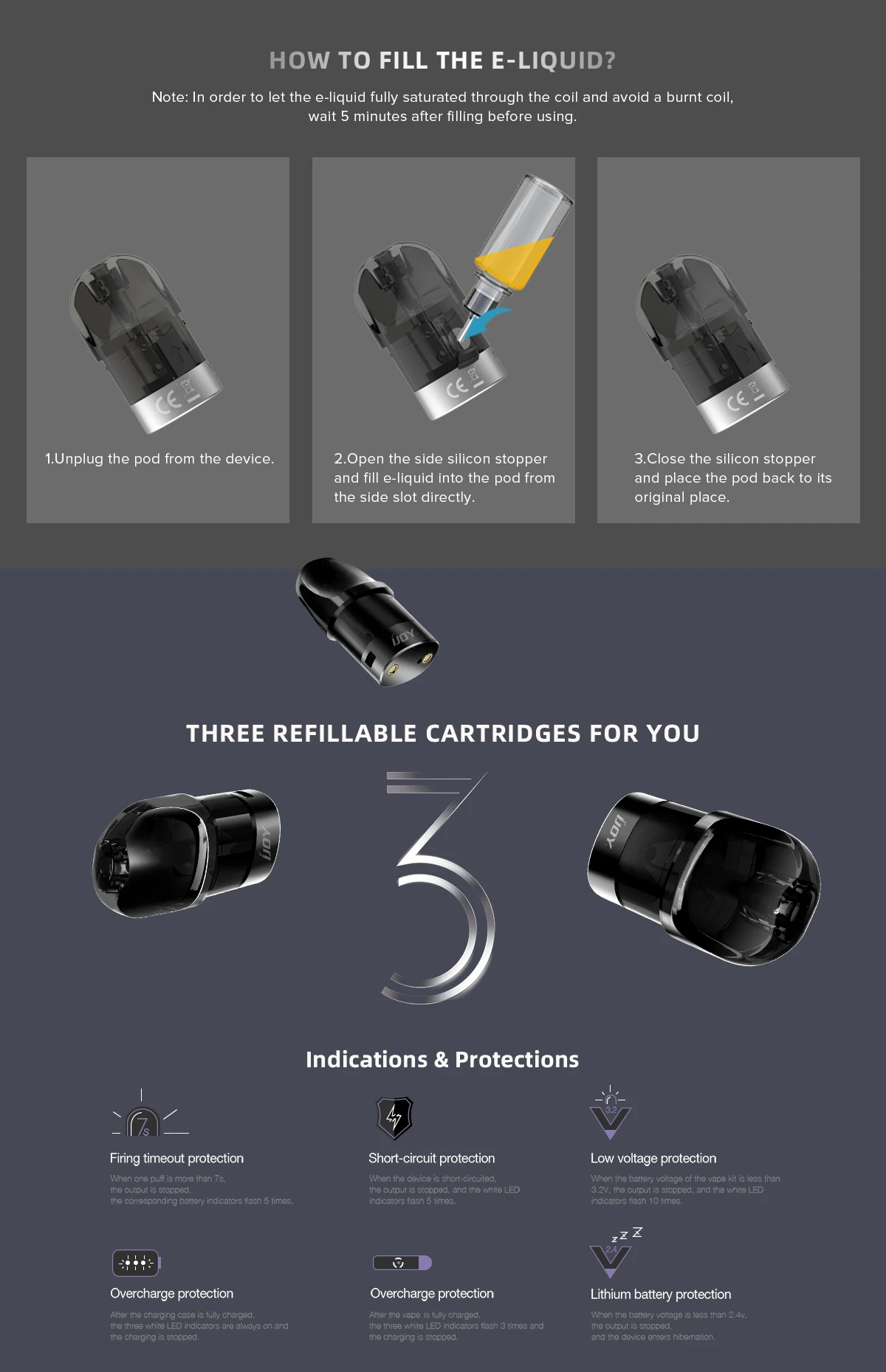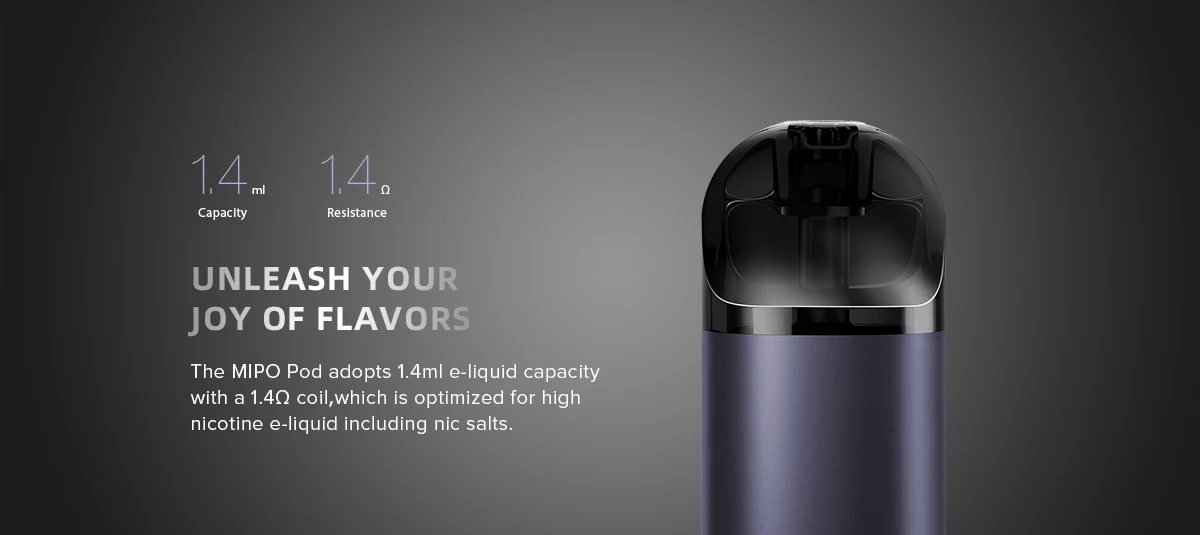 TheMIPO pod adopte une capacité de jus électronique de 1,4 ml avec une résistance de bobine de 1,4 Ω, qui est optimisée pour une teneur élevée en nicotine, y compris les sel nic. Trois cosses inclus.