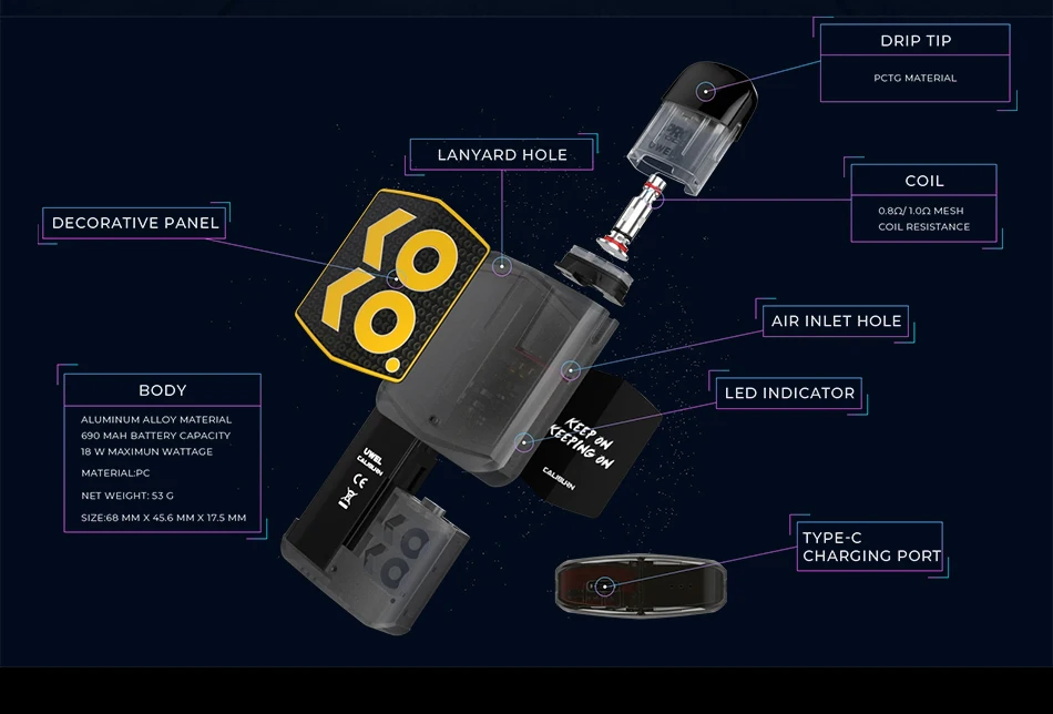 Uwell Caliburn KOKO Prime est une version améliorée de l’original Uwell Caliburn KOKO, avec une série de mises à jour et d’améliorations en termes de matériau, de performance et de saveur. Équipé de la même taille compacte que le Caliburn KOKO original, design rectangulaire, pas de boutons sur le corps, et fabriqué en matériaux PC + ABS légers et durables. Les utilisateurs peuvent également choisir de remplacer les panneaux décoratifs extérieurs pour une expérience personnalisée. Caliburn KOKO Prime dispose d’une batterie intégrée de 690mAh avec une plus grande capacité et utilise un port type-c plus rapide et plus pratique, qui peut être complètement chargé en moins d’une heure avec un courant de charge de 1,6a. Caliburn KOKO Prime dispose également d’un indicateur LED tricolore. Vous pouvez facilement connaître l’état de fonctionnement et les niveaux de batterie avec le voyant lumineux. Sa conception de commutateur d’air vous permet de passer directement à la vapeur en inhalant sans avoir besoin de tenir des boutons.
