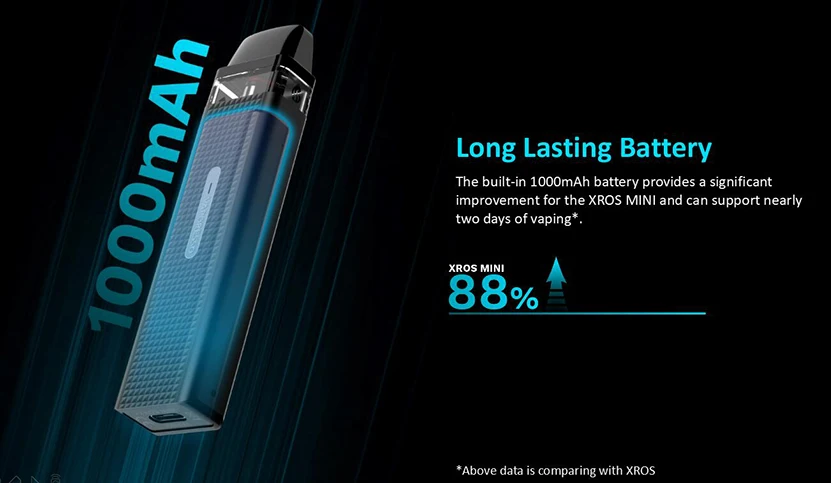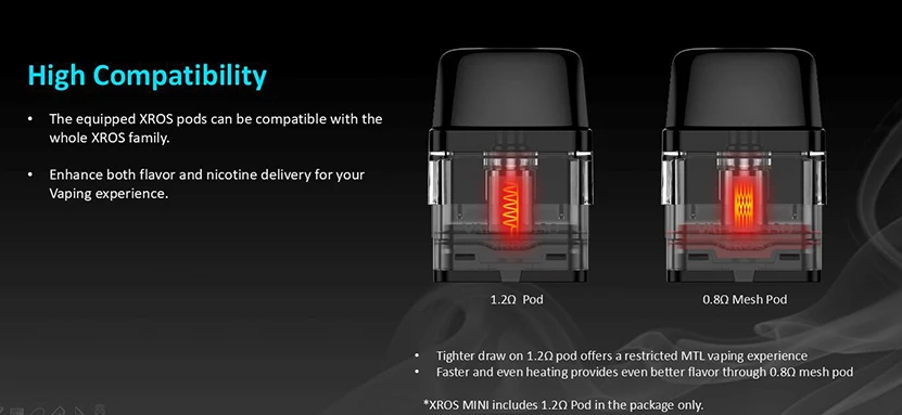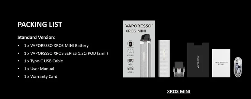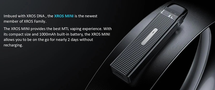 XROS Mini Kit est le produit le plus récent de la série XROS. Construit avec une taille compacte et une batterie intégrée de 1000mAh, il vous permet de vape pendant près de 2 jours sans recharger. Il est conçu avec un motif diamant, une base courbe raffinée pour un look prestigieux et un toucher plus lisse. XROS Mini continue à adopter la technologie SSS anti-fuite qui a fait ses preuves pour fonctionner efficacement dans les gousses vaporéso précédentes. XROS Mini est également compatible avec les dosettes XROS (dosette de maille 1.2ohm ou dosette de maille 0.8ohm). Il n’y a qu’une cosse 1.2ohm de 2ml dans l’emballage.