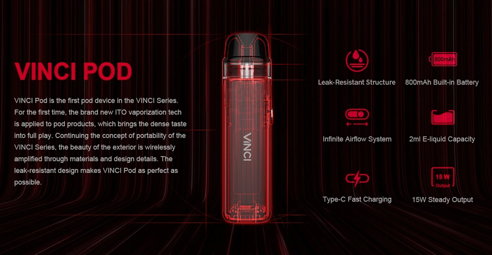 Le Kit VOOPOO Vinci Pod est le système unique de pod Vinci de la famille Vinci populaire. Intégrant une batterie rechargeable de 800mAh, le Vinci utilise le jeu de puces GENE intelligent avec une sortie constante de 15W et un mécanisme de tir activé par tirage pour une vaporisation agréable en déplacement. Construit en alliage de zinc durable, le Vinci Pod dispose d’un châssis compact bien conçu avec une finition CMF extraordinaire pour un look époustouflant. Vinci Pod adopte la conception étanche et le système de flux d’air infini, livré avec une bobine intégrée de 0,8 ohm mettant en œuvre la nouvelle technologie de vaporisation ITO pour produire une saveur optimale et une vapeur lisse.