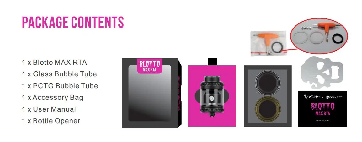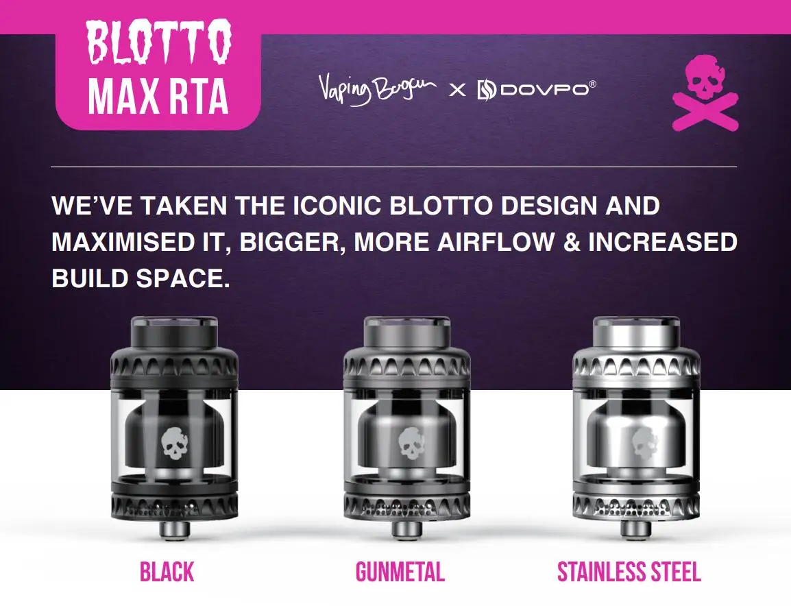 Bienvenue, la série Blotto chérie. Le réservoir Blotto Max RTA la série Blotto RTA est très adoré par les vapeurs RBA. Et cet hiver, vapoteur Bogan & DOVPO a publié le dernier Blotto Max RTA pour réaliser le rêve de tous les amoureux de Blotto. Nous avons pris le design de blotto emblématique et l’avons maximisé. Plus grand, plus de flux d’air et plus d’espace de construction. Flux d’air en nid d’abeille d’origine le Blotto Max RTA continue l’anneau d’air en nid d’abeille d’origine, qui est lisse à régler. Il est également livré avec nid d’abeille