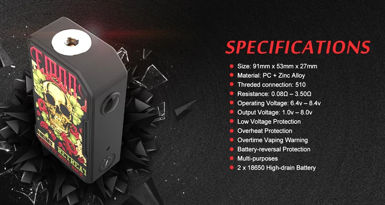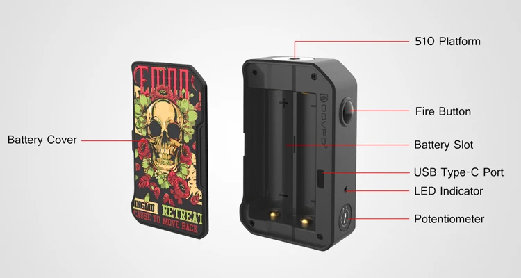 MVV 2 Mod de DOVPO est un mod mécanique basé sur potentiomètre avec des performances élevées. Il est alimenté par deux batteries 18650 avec une sortie maximale de 280W. Plusieurs protections sont appliquées pour garantir un vapotage sûr et stable. Et il est livré avec un port USB type-c intégré pour une utilisation pratique. Équipé d’un indicateur LED tricolore, il affiche clairement le niveau réel de la batterie. Il est livré avec un couvercle de batterie nouvellement conçu avec des impressions colorées. Et le panneau magnétique est interchangeable pour un aspect personnalisé. Il dispose également d’un bouton d’incendie ergonomique pour une utilisation facile.
