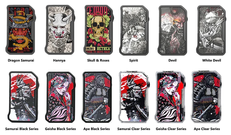 Couleur: Dragon samurai, Hannya, Skull & Roses, Spirit, Devil, White devil, Ape(Black Series), Ape(Clear Series), Geisha(Black Series), geisha (série claire), samouraï (série noire), samouraï (série claire)