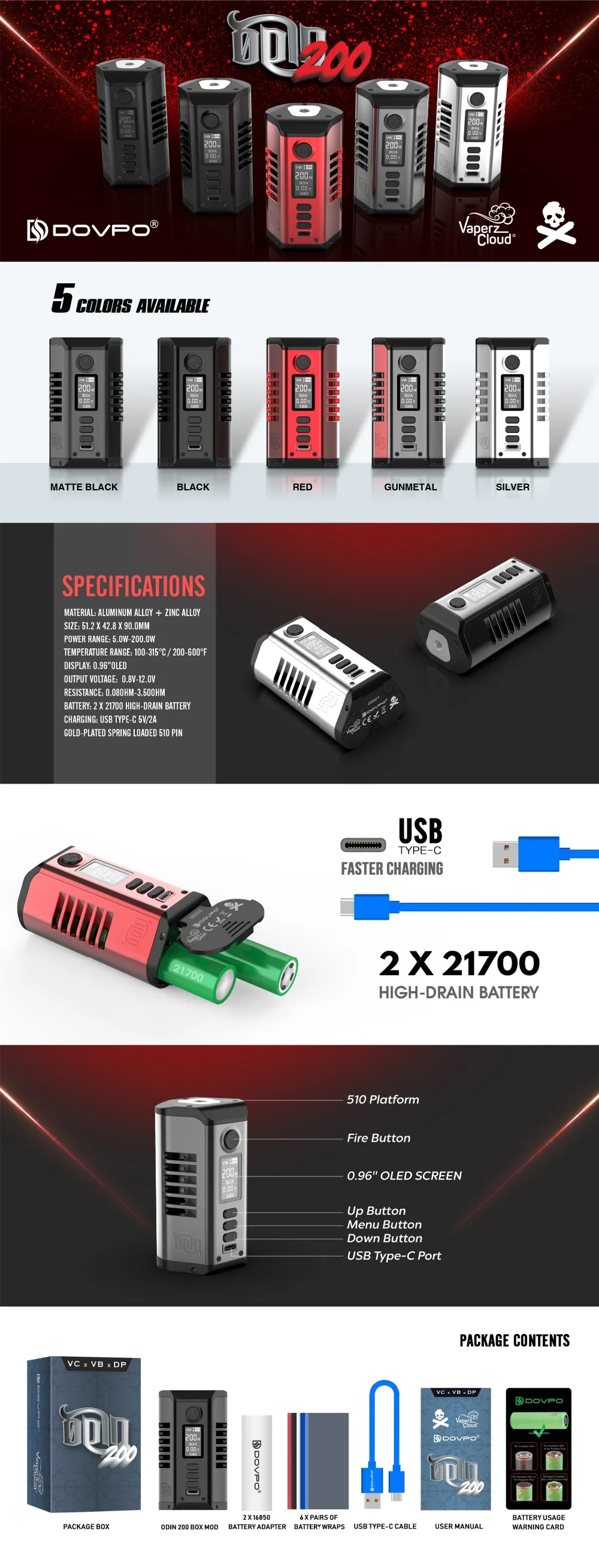 Odin 200 Mod est une collaboration de Dovpo, Vaperz Cloud et Youtube review, the Vaping Bogan. Il adopte un alliage d’aluminium durable et un matériau en alliage de zinc, qui vous apportera une sensation de main confortable. Et alimenté par deux batteries 21700, il vous fournira une excellente sortie jusqu’à 200W. Et il est équipé d’un écran OLED de 0.96 pouces pour afficher les détails de vapotage. De plus, il utilise des portes de batterie à chargement par le bas pour un fonctionnement pratique. De plus, adoptant 510 broches, il est livré avec la pièce pour accueillir des atomiseurs jusqu’à 30mm.