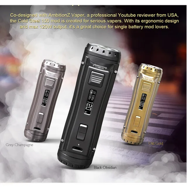 Cold Steel 100 Mod de Ehpro est un Mod de boîte super puissant et portable. Il est conçu en collaboration avec le critique de vape YouTube senior — AmbitionZ Vaper. Alimenté par une batterie 21700, le mod peut tirer jusqu’à 120W avec une vitesse de tir ultra-rapide de 0.0018S et il est également compatible avec les batteries 20700 ou 18650. Il dispose également de modes de fonctionnement PWR/TEMP/ CURVE /VOLT/BYPASS haute performance. C’est un mod durable qui est fabriqué à partir d’une combinaison de laiton solide, d’alliage de Zinc et d’acier inoxydable. Avec la construction entièrement métallique et la conception ultra ergonomique, il est durable à utiliser avec une sensation de main fantastique. Vous pouvez recharger la batterie à l’aide du port micro-USB et mettre à jour le firmware. Disponible en 2 couleurs: obsidienne noire, Champagne gris.