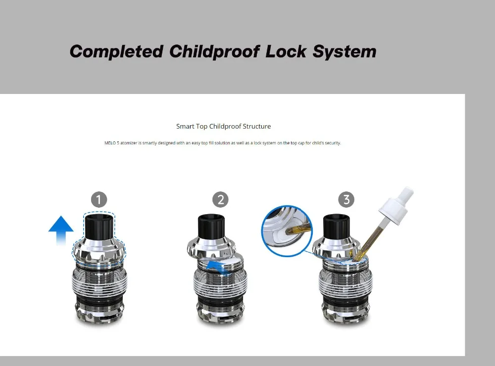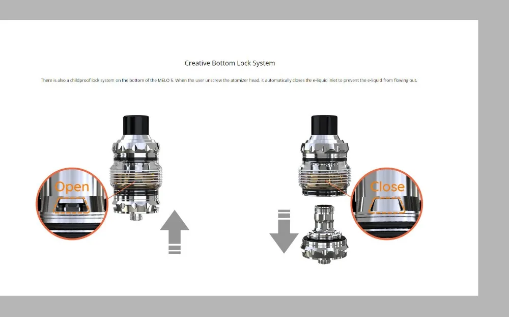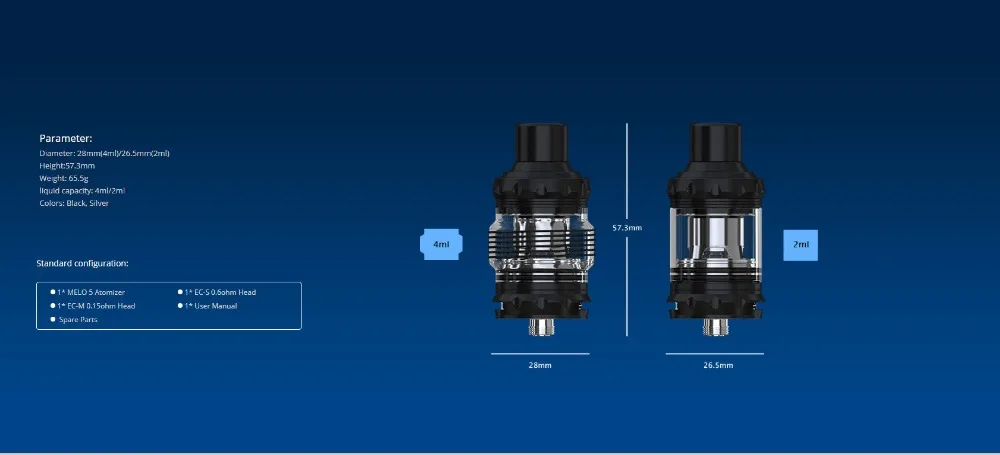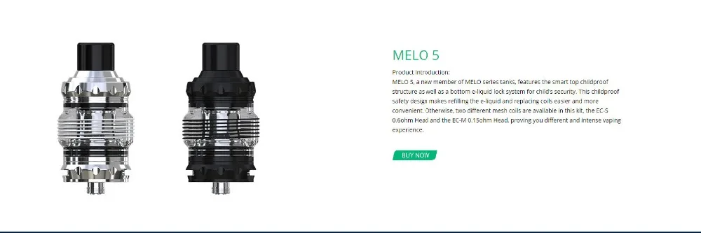 MELO 5, un nouveau membre des réservoirs de la série MELO, dispose de la structure intelligente supérieure pour enfants ainsi que d’un système de verrouillage e-liquide inférieur pour la sécurité des enfants. Cette conception de sécurité à l’épreuve des enfants rend le remplissage de e-liquide et le remplacement des bobines plus facile et plus pratique. Sinon, deux bobines de maille différentes sont disponibles dans ce kit, la tête EC-S 0,6 ohm et la tête EC-M 0,15 ohm, vous prouvant une expérience de vapotage différente et intense.