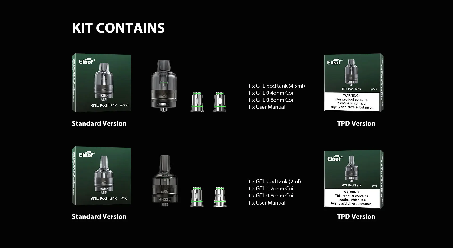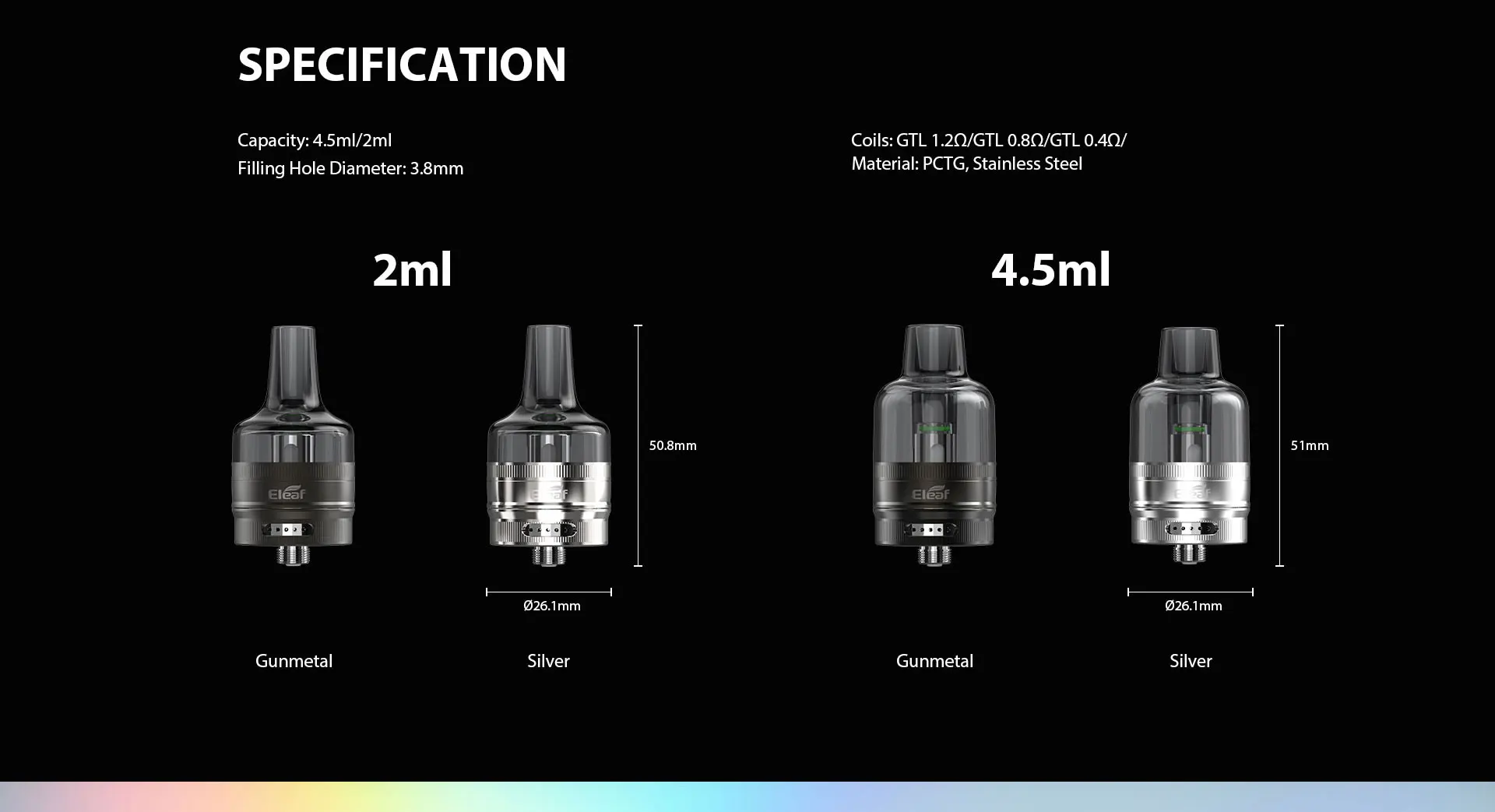 Eleaf GTL Pod Tank a deux versions, 4.5ml (taille: Ø26.1x51mm) . Eleaf GTL Pod Tank est compatible avec les bobines GTL, et les bobines supportées comprennent GTL 1.2Ω, GTL 0.8Ω et GTL 0.4Ω. Eleaf GTL Pod Tank est converti en MTL & DL design, avec connexion magnétique, rend le changement de bobine et le remplissage e-liquide plus facile que jamais. Il est disponible en couleur bronze et argent. Eleaf GTL Pod Tank est utilisé avec Eleaf Istick T80 Mod pour produire de gros nuages et une saveur pure.