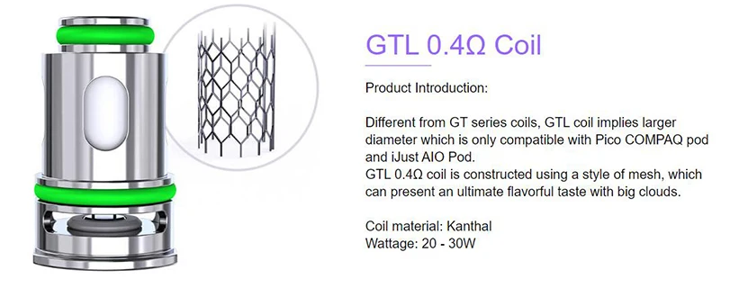 La bobine Eleaf GTL est compatible avec Pico compack, iJust AIO,iSolo R et Glass Pen. Il est livré avec une bobine KAL de 0,4 ohm qui a été construite en utilisant un style de maille pour présenter un goût savoureux ultime avec de gros nuages. La bobine GTL est livrée avec deux nouvelles résistances: la bobine GTL 1,2 ohm avec une plage de puissance de 7-13W et GTL 0,8 ohm avec 12-18W. 5 pièces par paquet.