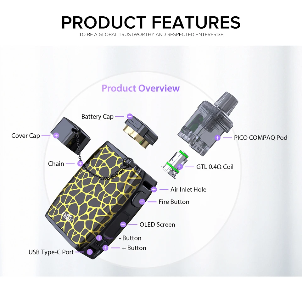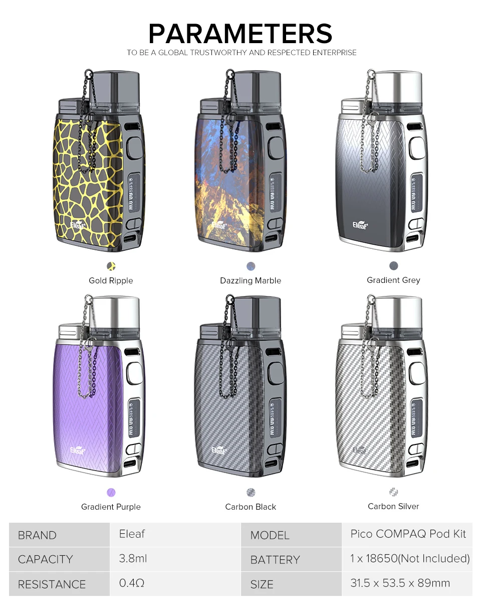 Eleaf Pico compag est un pod mod style vape qui est construit avec une haute qualité et un excellent design. Alimenté par une seule cellule 18650, Pico compag peut vous offrir une puissance de 60 watts et une durée de vie plus longue. Emballage du double flux d’air unique et des nouvelles bobines de maille GTL, Pico compag peut vous satisfaire la saveur ultime et les préférences des nuages. Son design élégant améliore également votre plaisir visuel et votre confort ergonomique.