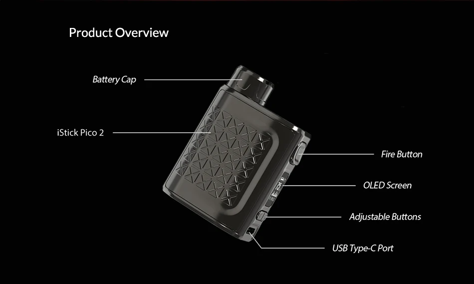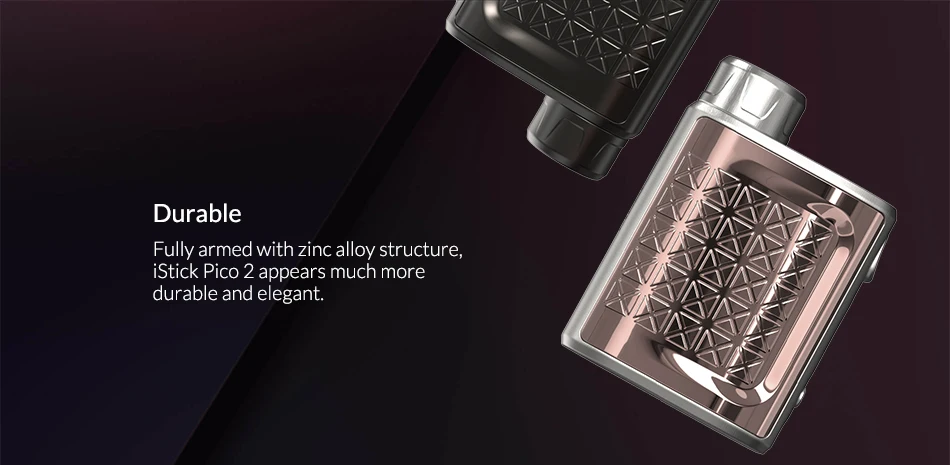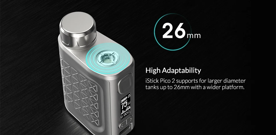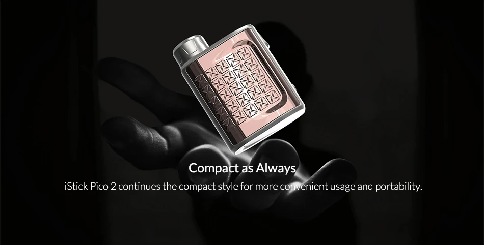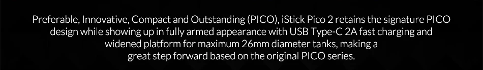 Préférable, innovant, Compact et exceptionnel (PICO), iStick Pico 2 conserve la conception de PICO signature tout en présentant une apparence entièrement armée avec charge rapide USB type-c 2A et plate-forme élargie pour les réservoirs de diamètre maximum de 26mm, faire un grand pas en avant basé sur la série PICO originale.