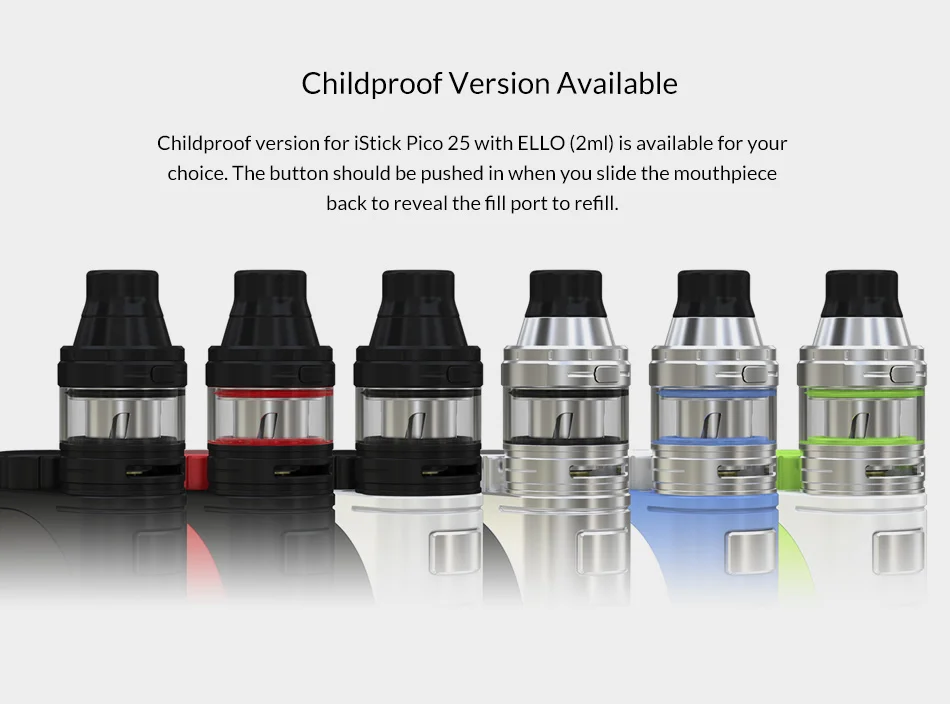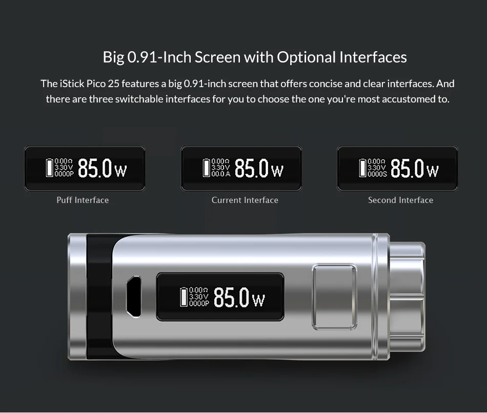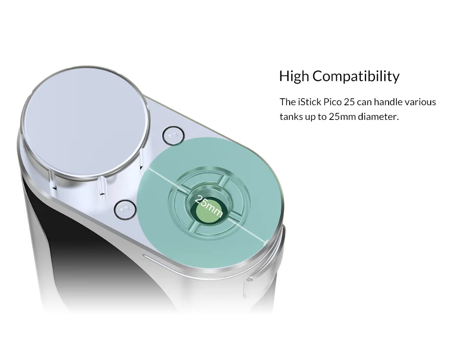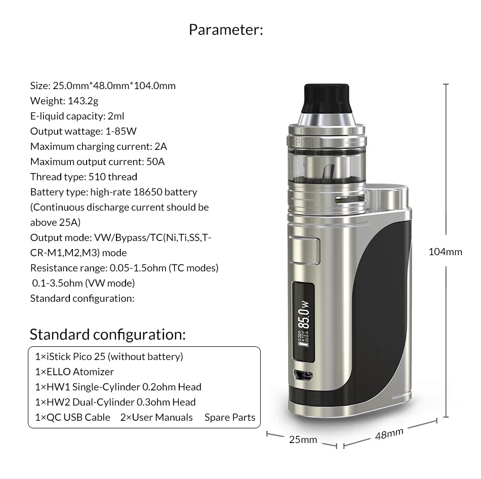 IStick Pico 25 emballe ingénieusement un grand écran de 0.91 pouces qui offre une interface concise et claire, une capacité de charge rapide 2A et un micrologiciel évolutif avec fonction de préchauffage dans un emballage compact, élégant mais puissant. Alimenté par une seule batterie 18650, iStick Pico 25 est capable de produire une puissance maximale de 85W et peut gérer divers réservoirs jusqu’à 25mm de diamètre. L’atomiseur ELLO qui dispose de la bobine HW pour une saveur ultime et un dessus rétractable pour un remplissage facile se marie parfaitement avec iStick Pico 25 en termes d’apparence et de performance.