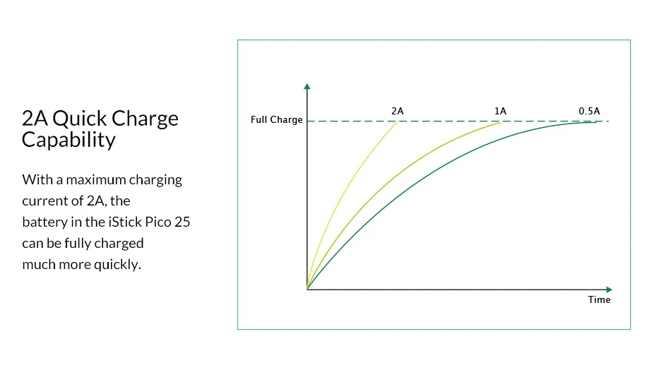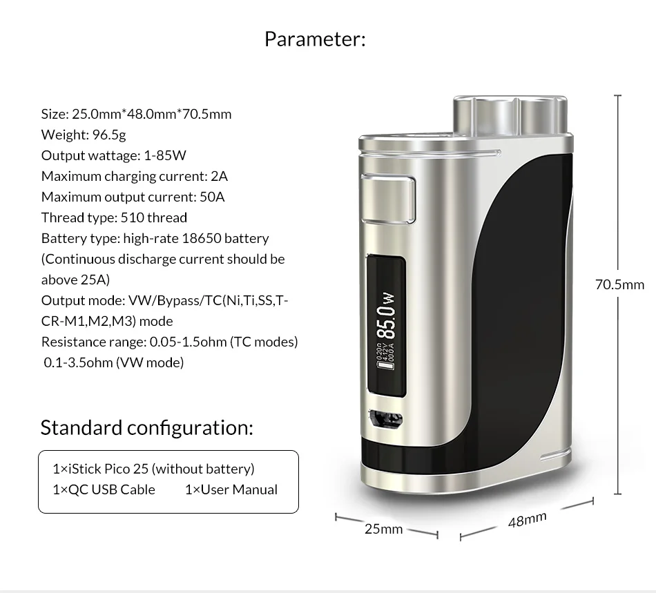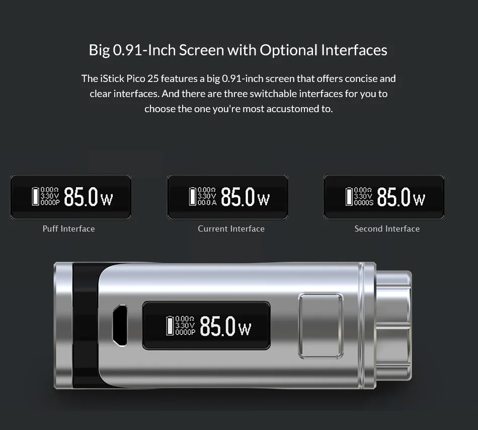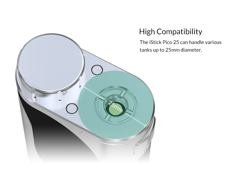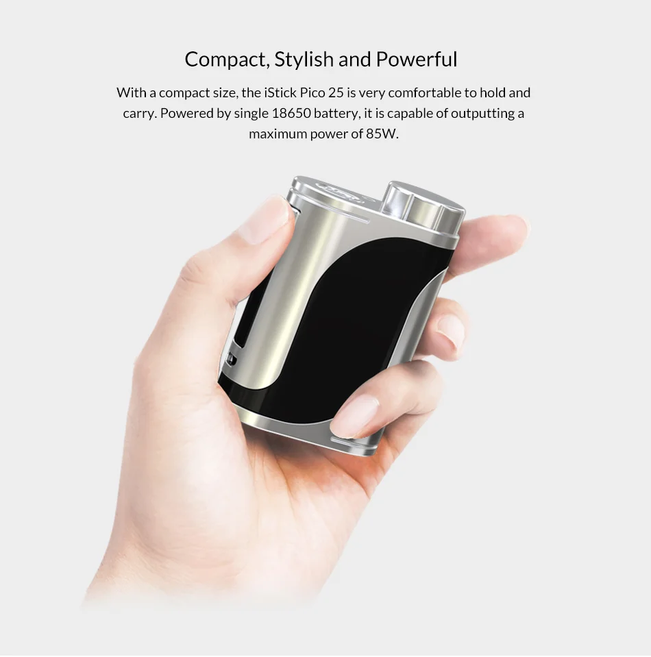 IStick Pico 25 emballe ingénieusement un grand écran de 0.91 pouces qui offre une interface concise et claire, une capacité de charge rapide 2A et un micrologiciel évolutif avec fonction de préchauffage dans un emballage compact, élégant mais puissant. Alimenté par une seule batterie 18650, iStick Pico 25 est capable de produire une puissance maximale de 85W et peut gérer divers réservoirs jusqu’à 25mm de diamètre. L’atomiseur ELLO qui dispose de la bobine HW pour une saveur ultime et un dessus rétractable pour un remplissage facile se marie parfaitement avec iStick Pico 25 en termes d’apparence et de performance.