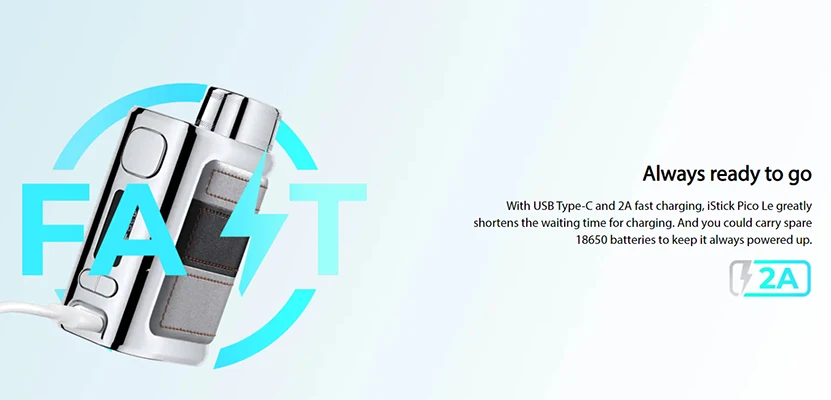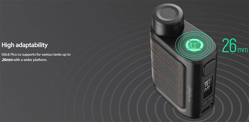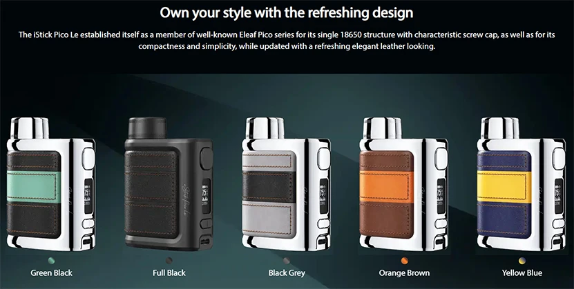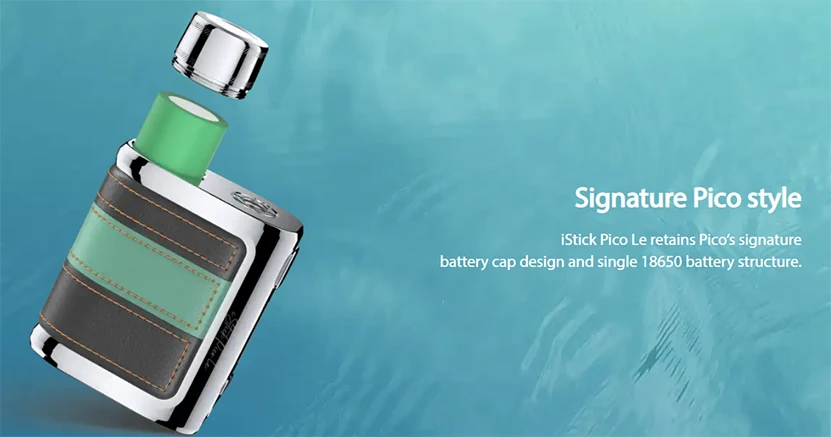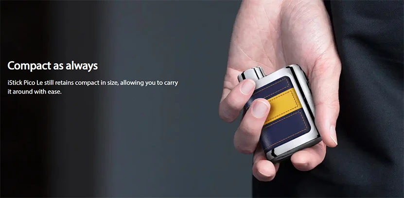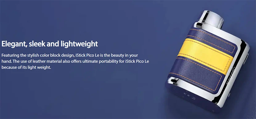 IStick Pico Le Mod présente un design de bloc de couleur élégant et un matériau en cuir pour devenir élégant et léger. Il conserve la conception de capuchon de batterie signature de Pico et la structure de batterie unique 18650. Avec USB type-c et 2A charge rapide, il peut raccourcir votre temps de charge et vous permettre de profiter de plus de vapotage. Il est compatible avec le réservoir Eleaf GX qui utilise la bobine GX alimentée par AST tech. L’acier inoxydable de la bobine GX et Le jeu de puces à l’intérieur de iStick Pico Le peuvent protéger la bobine contre les coups secs. Eleaf iStick Pico Le Mod prend également en charge divers réservoirs jusqu’à 26mm. De plus, il est assez compact pour vous permettre de le transporter facilement.