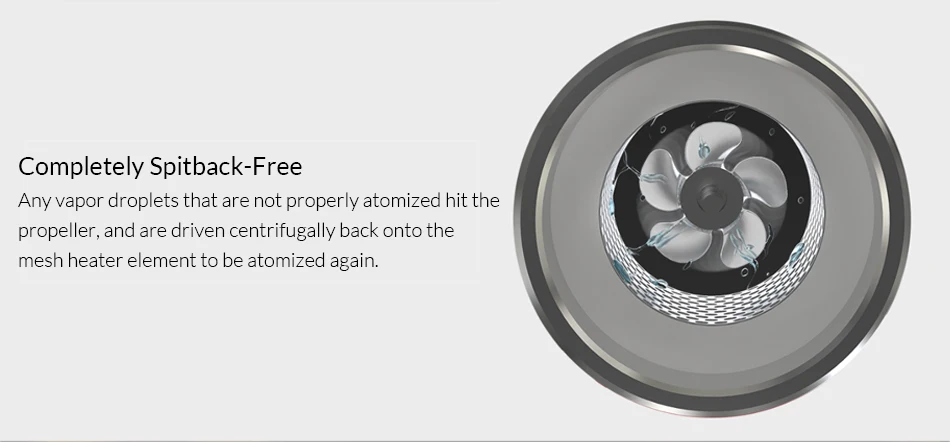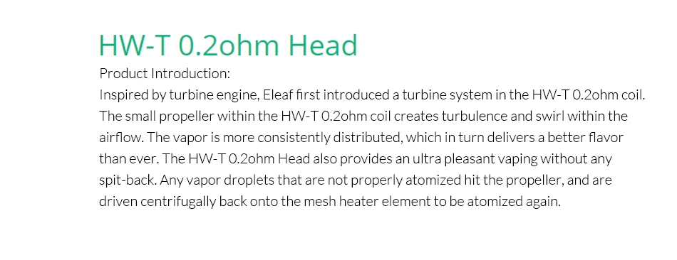 Inspiré du moteur à turbine, Eleaf a d’abord introduit un système de turbine dans la bobine HW-T 0,2ohm. La petite hélice dans la bobine de HW-T 0,2ohm crée des tourbillon dans le flux d’air. La vapeur est répartie plus régulièrement, ce qui à son tour donne une meilleure saveur que jamais. La tête HW-T 0,2ohm fournit également une vaporisation ultra agréable sans aucune broche. Les gouttelettes de vapeur qui ne sont pas correctement atomisées frappent l’hélice, et sont enfoncées centrifuge sur l’élément chauffant à mailles pour être atomisées à nouveau.