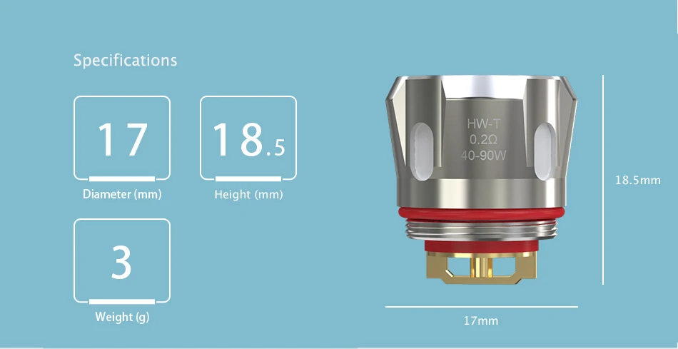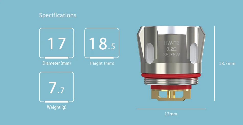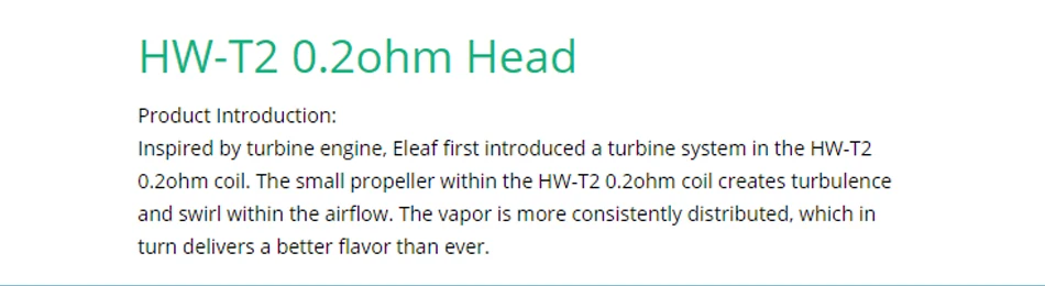 Inspiré du moteur à turbine, Eleaf a d’abord introduit un système de turbine dans la bobine HW-T2 0,2ohm. La petite hélice dans la bobine de HW-T2 0,2ohm crée des tourbillon dans le flux d’air. La vapeur est répartie plus régulièrement, ce qui à son tour donne une meilleure saveur que jamais.