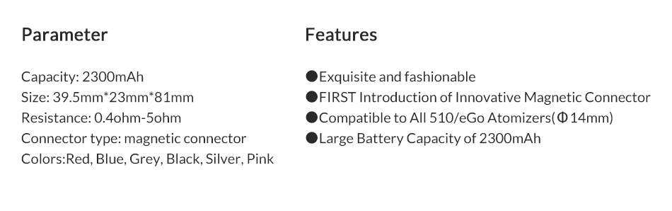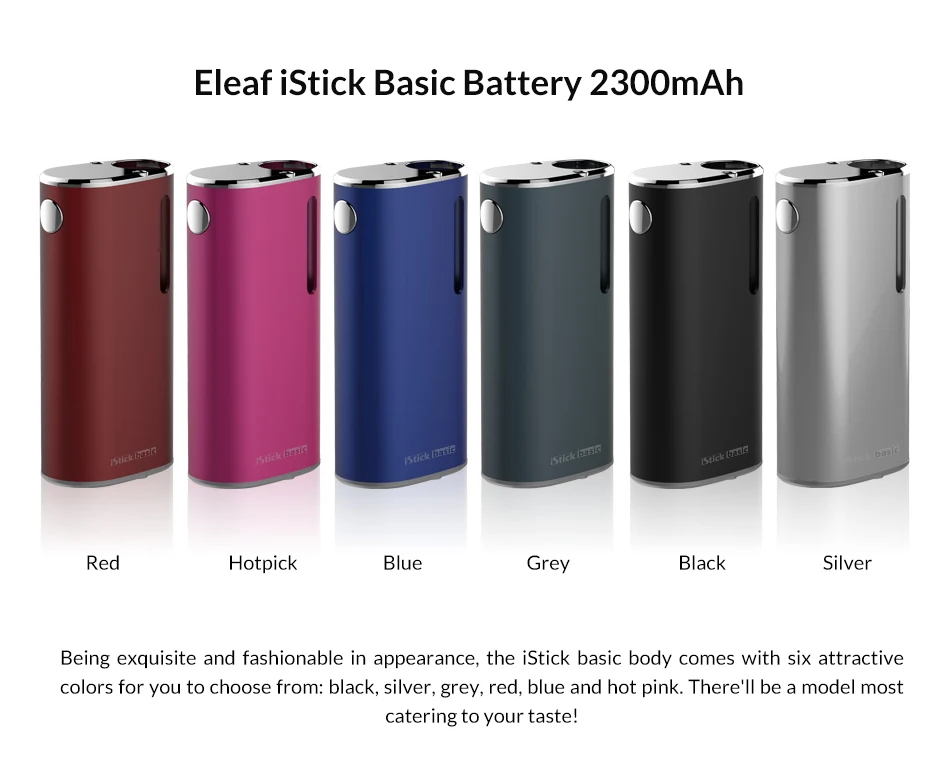 D’une apparence exquise et à la mode, le corps iStick basic est livré avec six couleurs attrayantes au choix: noir, argent, gris, rouge, bleu et rose vif. Il y aura un modèle le plus satisfaisant à votre goût!