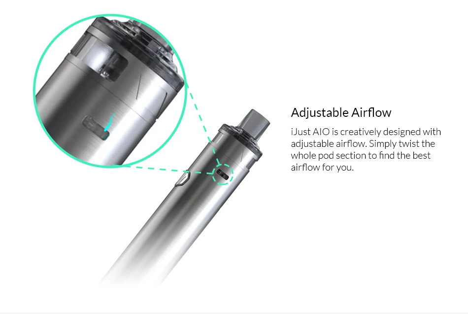 IJust AIO est conçu de manière créative avec un flux d’air réglable. Il suffit de tourner toute la section du pod pour trouver le meilleur flux d’air pour vous.