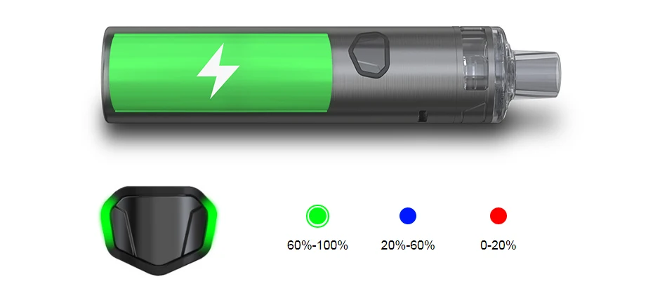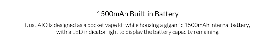 IJust AIO est conçu comme un kit de vape de poche tout en logant une énorme batterie interne de 1500mAh, avec un voyant LED pour afficher la capacité restante de la batterie