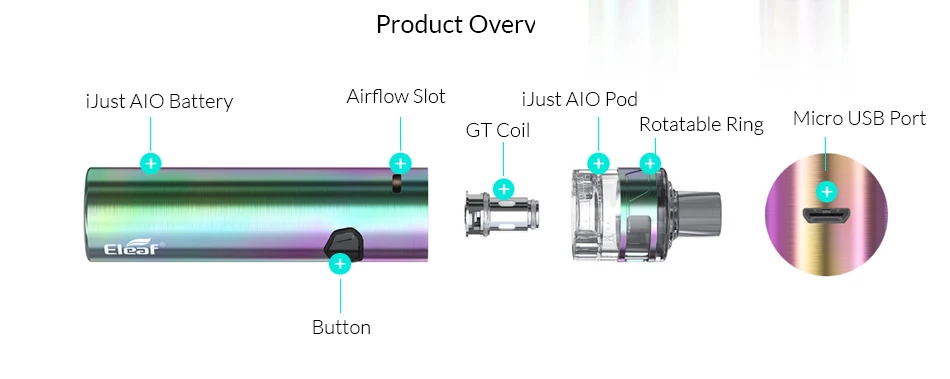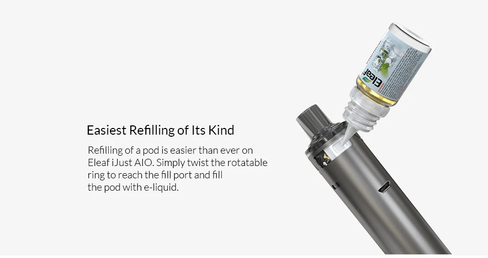 Le remplissage d’un pod est plus facile que jamais sur Eleaf iJust AIO. Il suffit de tourner l’anneau rotatif pour atteindre l’orifice de remplissage et de remplir le pod d’e-liquide