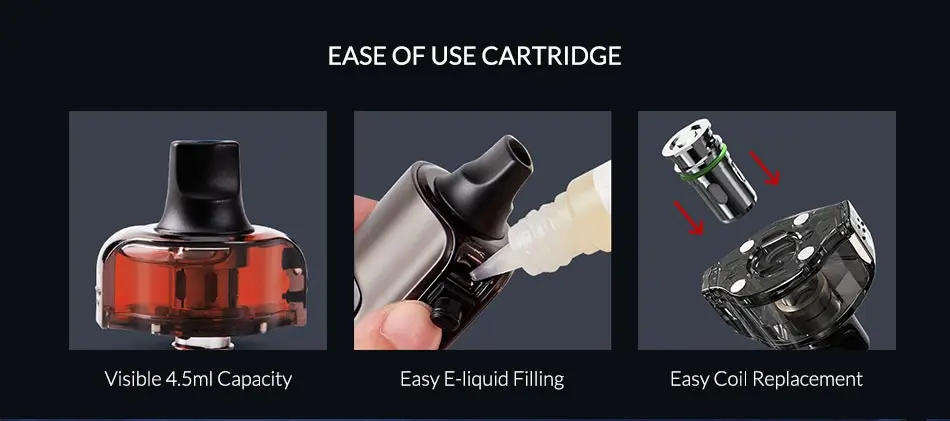 Le Kit Eleaf iStick P100 est équipé d’une cartouche de grande capacité de 4.5ml, en plastique PCTG de qualité alimentaire respectueux de l’environnement. L’embout buccal intégré en haut de la cartouche offre simplicité et confort lorsque vous allez pour un vapoteur. Cette cartouche de dosette dispose d’une méthode de remplissage latéral étanche facile d’accès. Le kit est livré avec deux bobines de la série GZ nouvellement conçues, la bobine Eleaf GZ de 0,2 ohm et la bobine Eleaf GZ de 0,4 ohm, qui conviennent à la vaporisation DL (poumon Direct) et Half DL. Les deux bobines sont fabriquées avec du Kanthal et du coton de qualité supérieure pour une saveur optimale, des nuages satisfaisants et une vaporisation à long terme. Les bobines utilisent une méthode d’installation à pression, ce qui facilite l’échange des bobines au besoin.