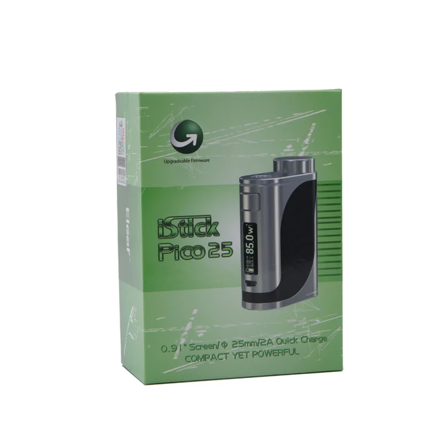 IStick Pico 25 emballe ingénieusement un grand écran de 0.91 pouces qui offre une interface concise et claire, une capacité de charge rapide 2A et un micrologiciel évolutif avec fonction de préchauffage dans un emballage compact, élégant mais puissant. Alimenté par une seule batterie 18650, iStick Pico 25 est capable de produire une puissance maximale de 85W et peut gérer divers réservoirs jusqu’à 25mm de diamètre. Avec une taille compacte, vous pouvez le tenir dans la paume, beaucoup plus pratique pour l’utilisation et la portabilité.