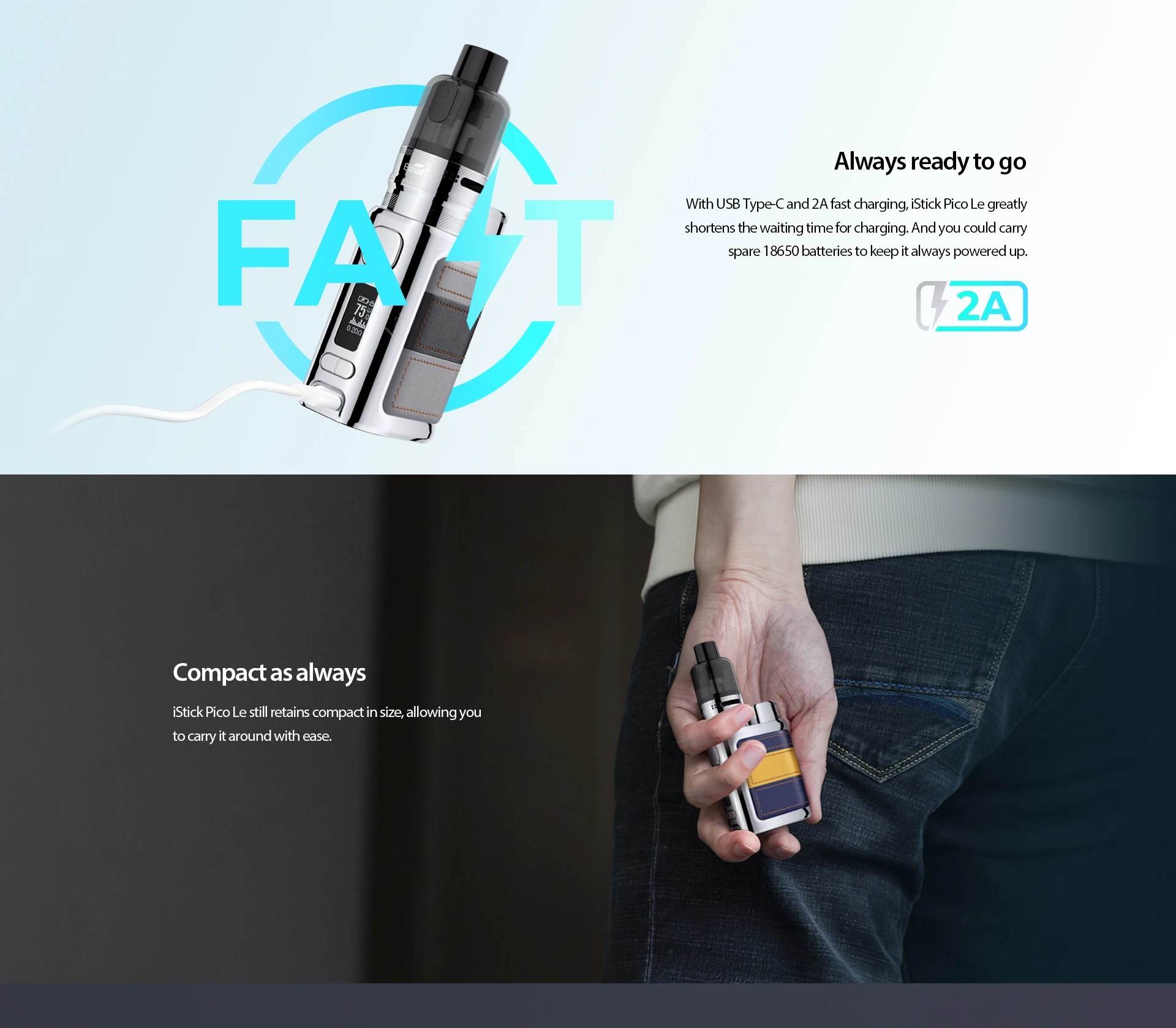 IStick Pico Le Kit avec réservoir GX présente un design de bloc de couleur élégant et un matériau en cuir pour devenir élégant et léger. Il conserve la conception de capuchon de batterie signature de Pico et la structure de batterie unique 18650. Avec USB type-c et 2A charge rapide, il peut raccourcir votre temps de charge et vous permettre de profiter de plus de vapotage. Il est également compact et portable, ce qui le rend facile à transporter partout. IStick Pico Le Kit avec réservoir GX a une capacité de 5ml et un système de remplissage facile sans fuite. Le réservoir GX peut produire un flux d’air concentré, directionnel et lisse pour une saveur intense et une vapeur dense. Il supporte également divers réservoirs jusqu’à 26mm. De plus, compatible avec les bobines GX qui présentent une structure en maille et de l’acier inoxydable à l’intérieur, iStick Pico Le Kit avec réservoir GX peut maximiser votre expérience de vapotage.
